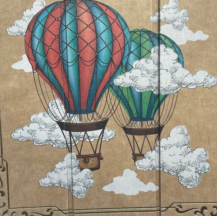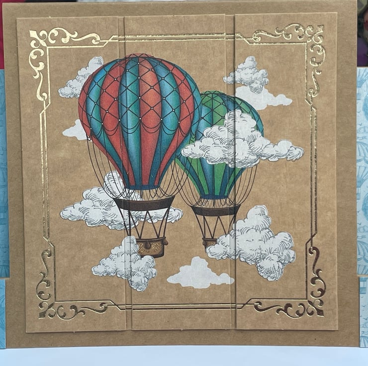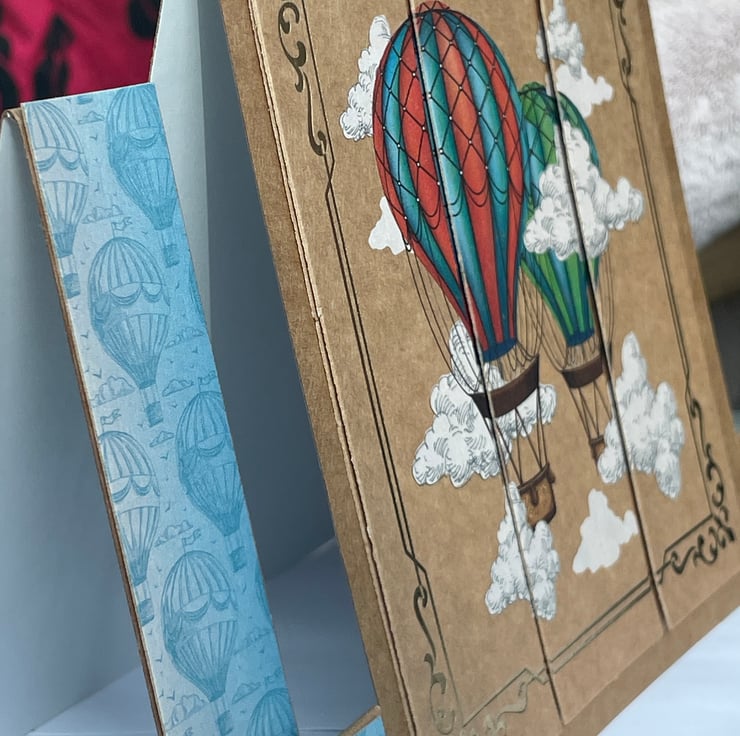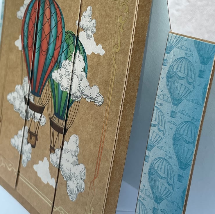 A little bit of vintage transport. This A5 sized card is a fancy tent fold that gives it a different feature. The main image is a triptych decoupage of 2 vintage hot air balloons surrounded by fluffy clouds. The image is set off with a blue border printed with more hot air balloons. An ideal card for many occasions including birthdays, Father's Day, Bon Voyage - the choice is yours.