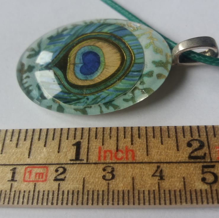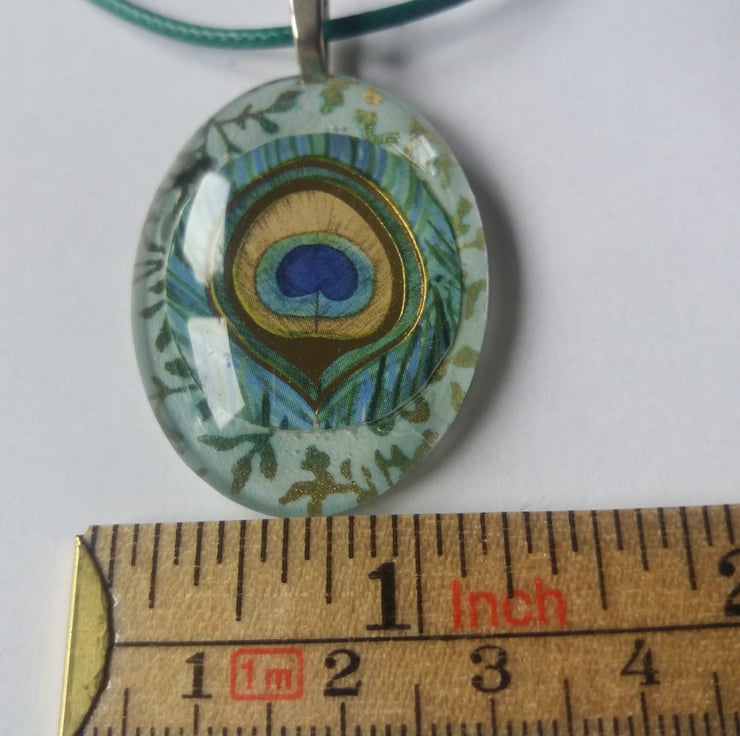 This is a pretty green patterned card backed glass cabochon pendant with a subtle slight sparkly shimmering effect.