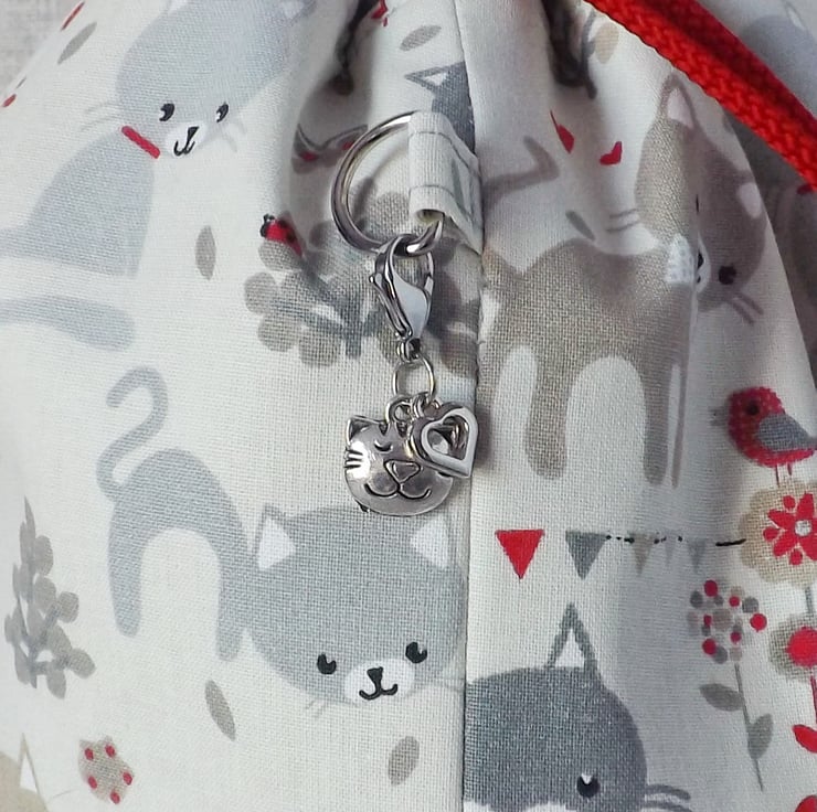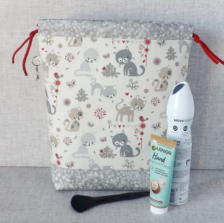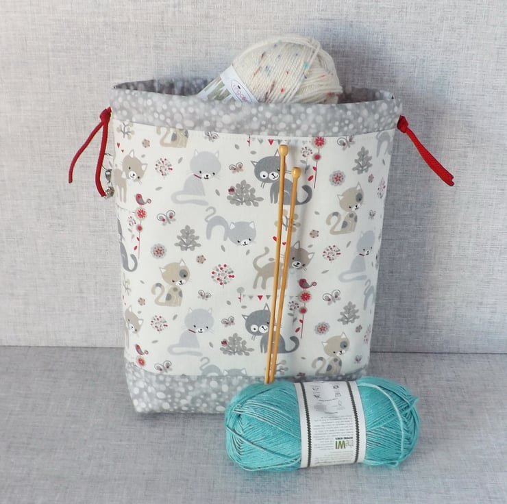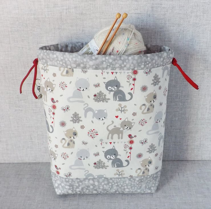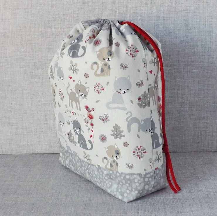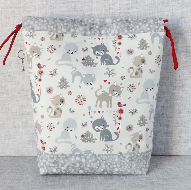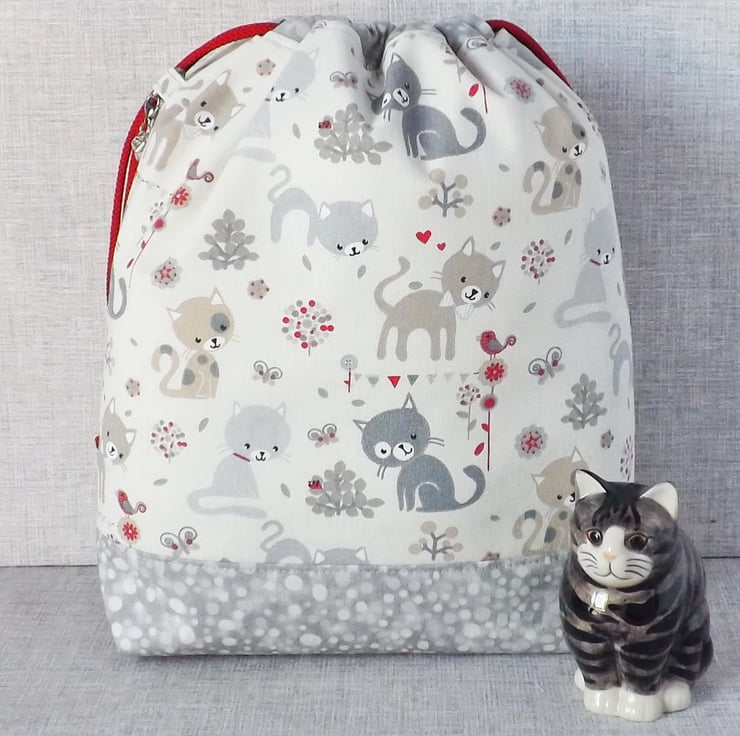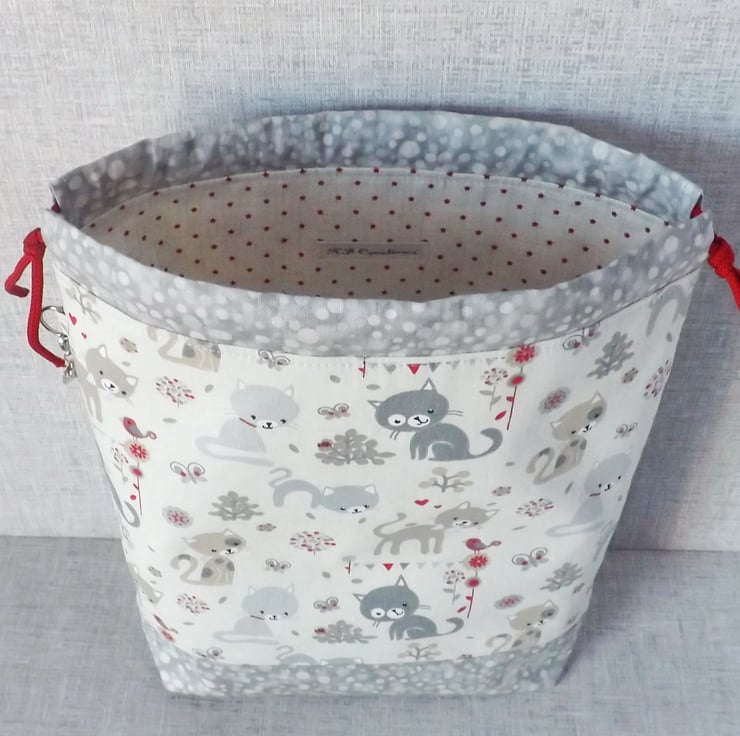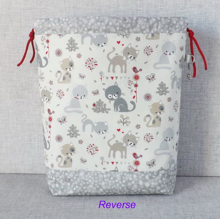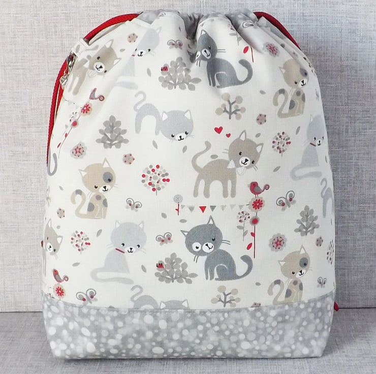 The main fabric has cats in shades of grey and beige, with butterflies, birds and flowers in shades of grey, beige & red, all on a cream background. This fabric has been combined with a grey tonal fabric and the bag is lined in a cream fabric with red stars on.