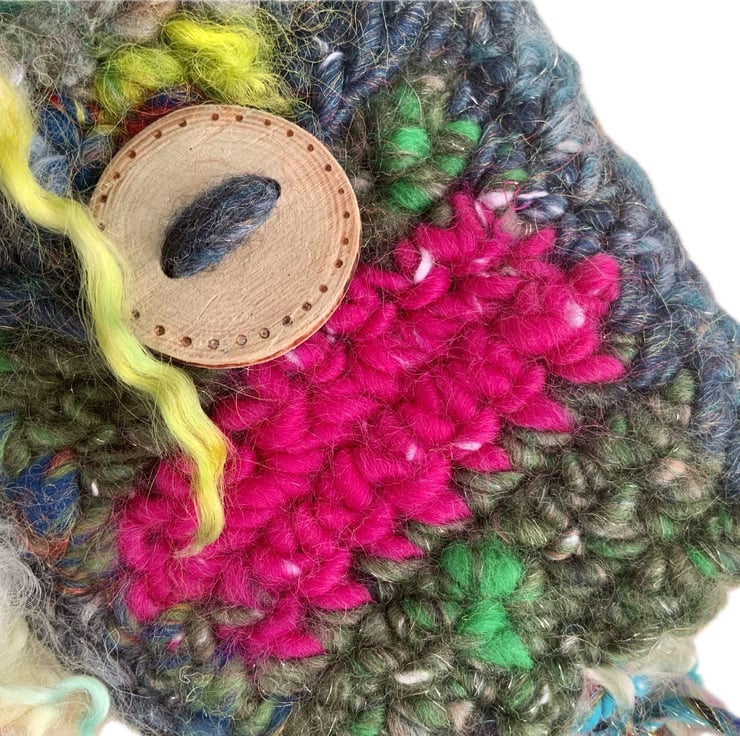 The art yarn used to make these lovely little bags is hand spun using a variety of different fibres: wool, sari silk, wool locks, plant fibres, and a bit of sparkle. Hand blended and carded into art batts and then spun into art yarn.