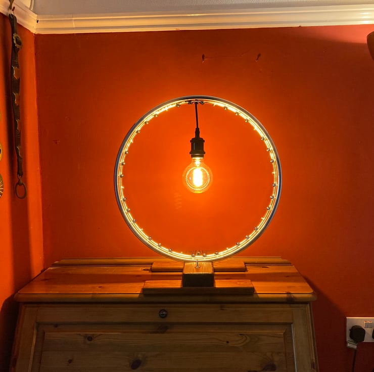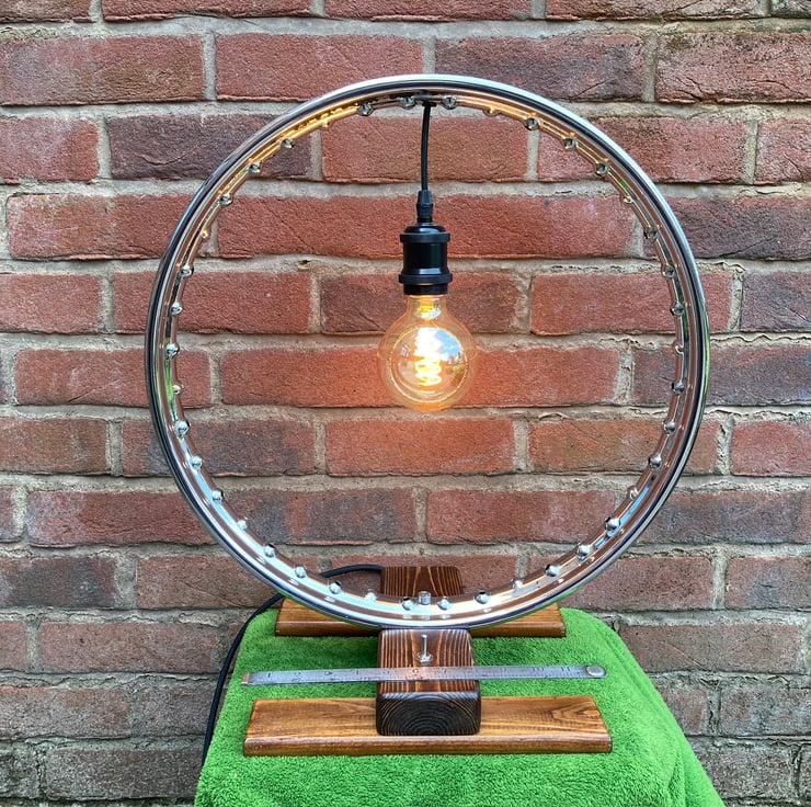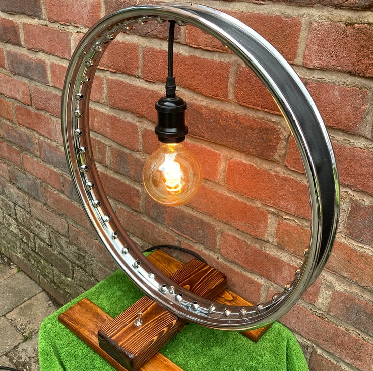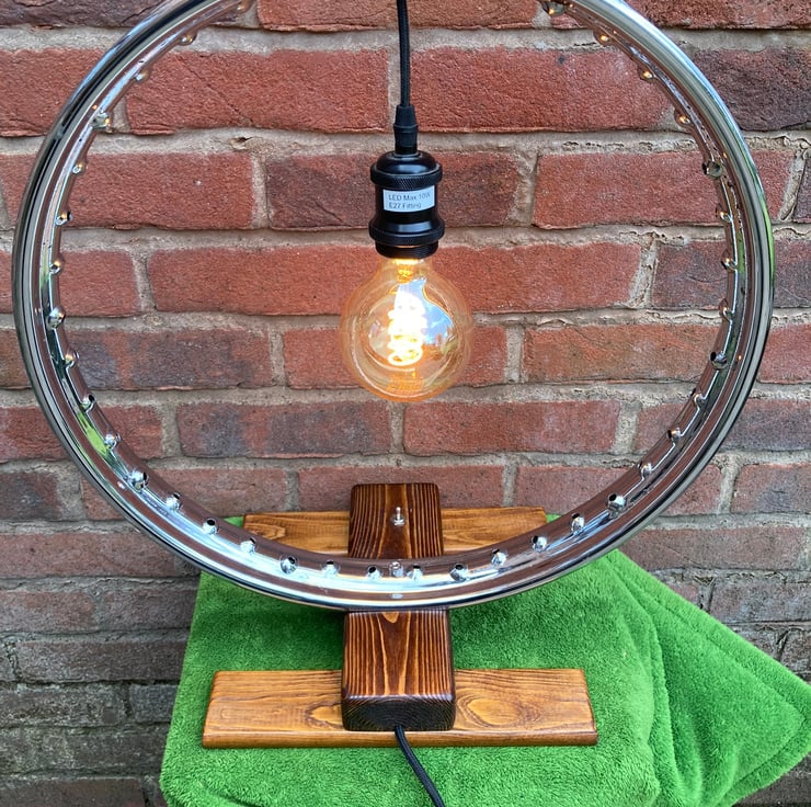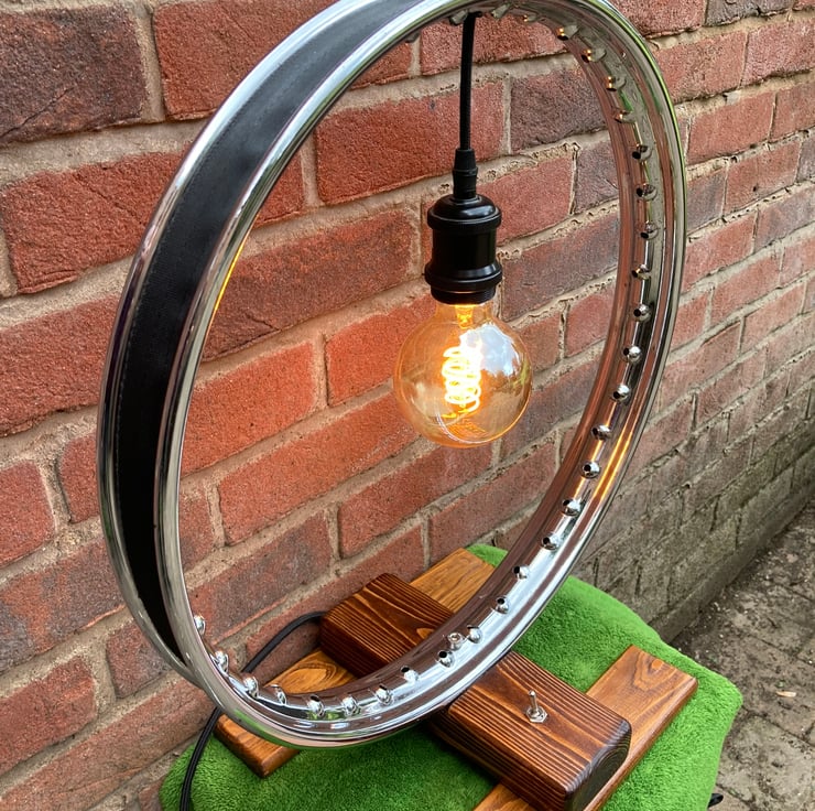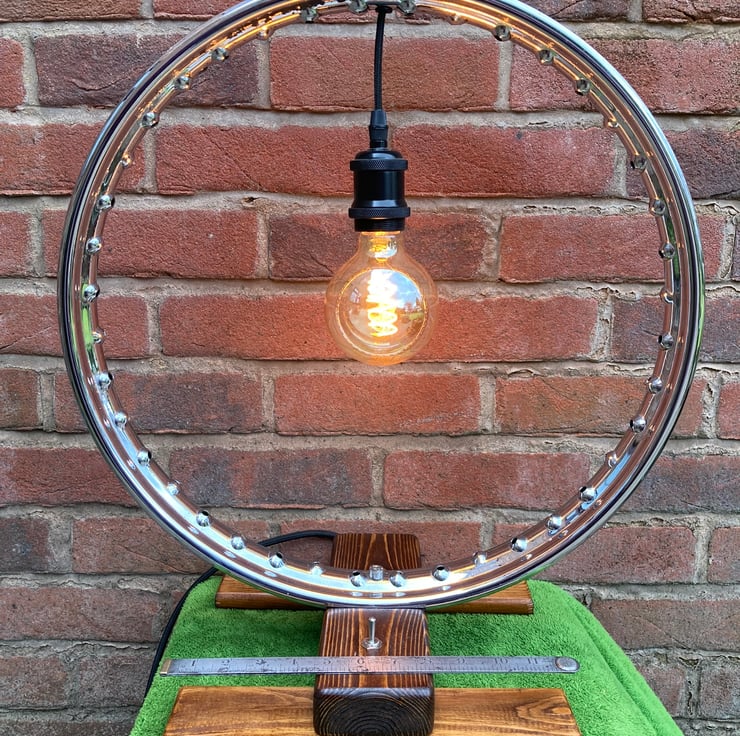 A statement chrome table lamp, made from a repurposed vintage 1950s BSA Bantam wheel rim, which combines contemporary, industrial and steampunk styles. I have secured the wheel to a salvaged wood base and fitted a new lampholder to hold a 4.5-Watt LED globe lamp with a spiral filament in the centre of the rim. This reflects the light from the chrome to form an attractive halo effect.
