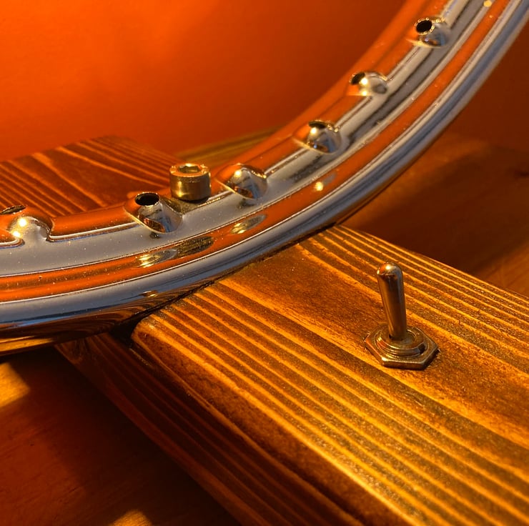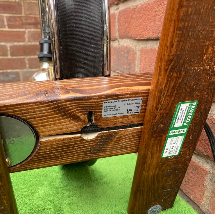 As the wheel rim is reclaimed vintage, it comes with some small marks and rust from its previous long working life. The lamp is secured onto a base made from reclaimed wood which I have sanded, dyed and French polished to give a nice sheen, it has an integral toggle switch and stands on four felt pads to protect your furniture.