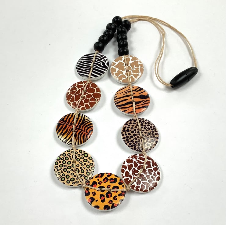 These lovely 2.5cm wooden, animal print buttons, have been threaded onto polyester thread to make an eye catching necklace. The necklace measures 53cm and ends with an easy to use plastic snap catch. Please note that the reverse of each button is white.