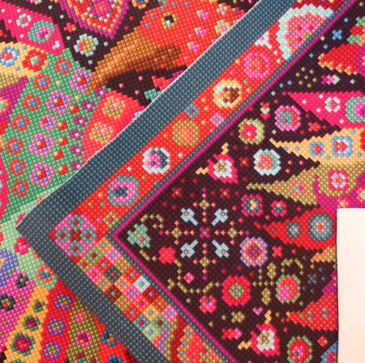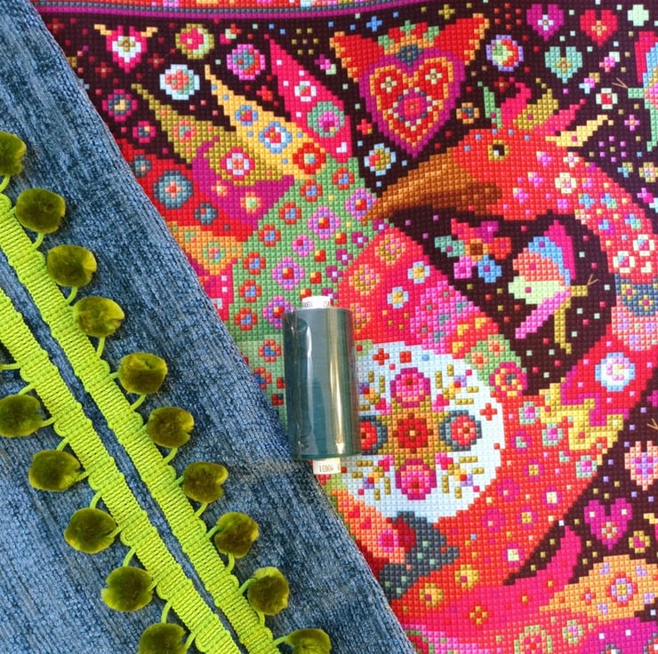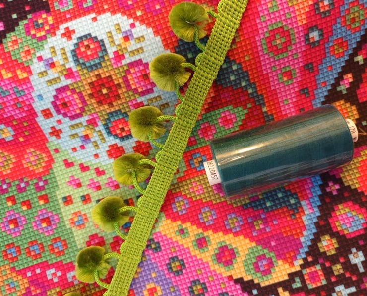 The fabric is a copy of one of my own tapestry kit designs. It's worked beautifully. I've added fabulous green pom-poms for you to sew all around.