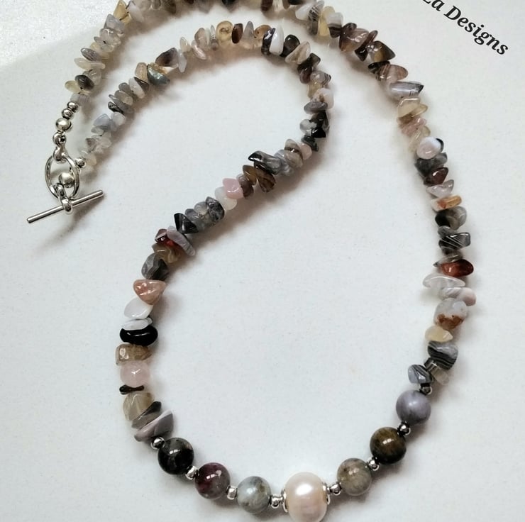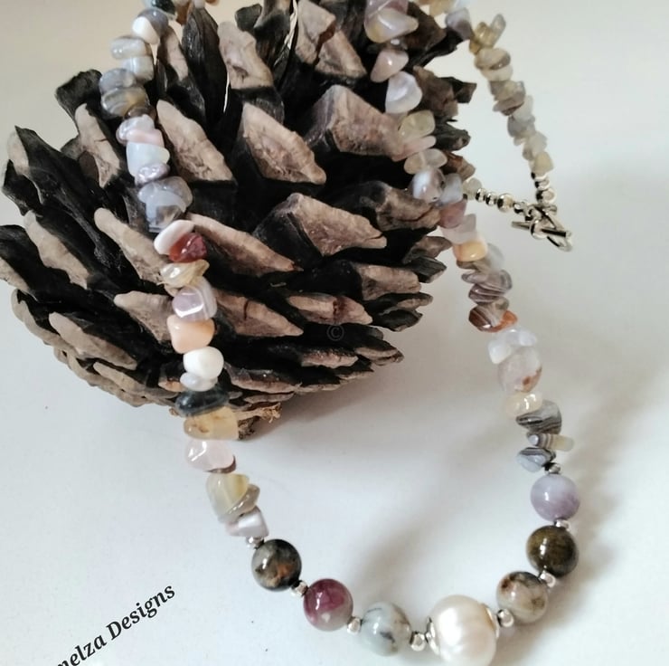 This totally natural gemstone necklace has been lovingly designed and hand crafted in Cornwall. In the ceatre is a large 12mm cream baroque culture pearl. Either side are e three botswana 8mm rounds following on with botswana agate nuggets. The pearl has quality silver plated bead caps with 2.5mm smaller silver plated spacer beads within the necklace design.