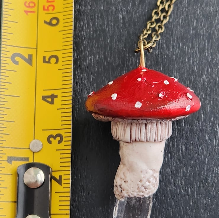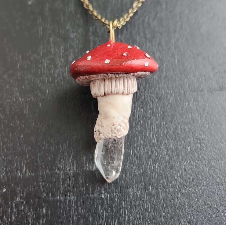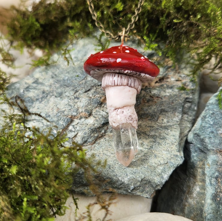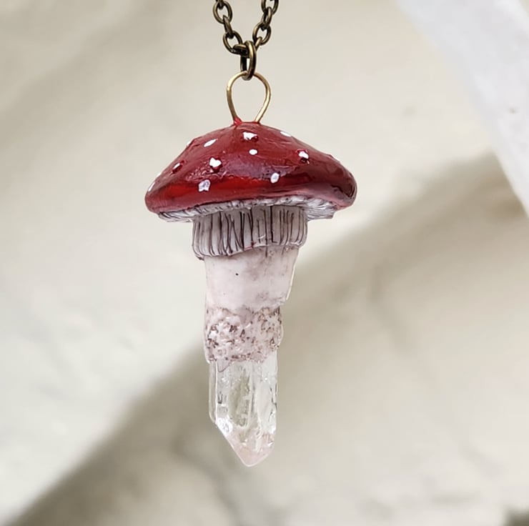 Inspired by fairy tale cottages and enchanted woods, this mushroom has been sculpted into a quartz crystal pointer then painted and sealed with acrylics.