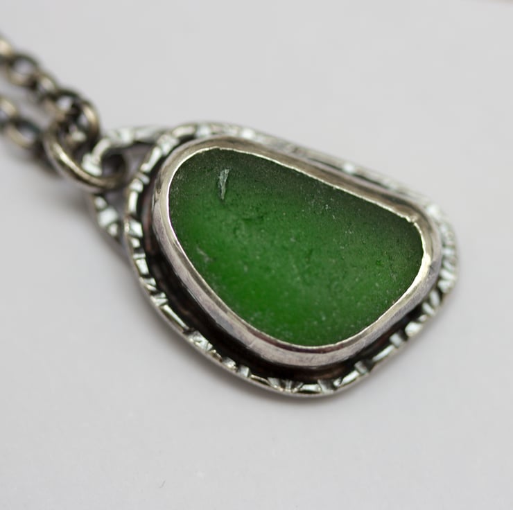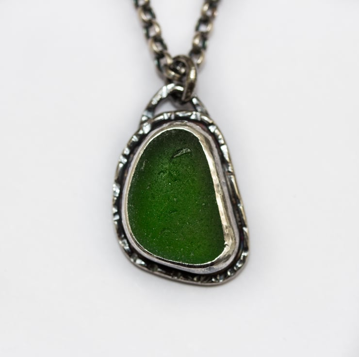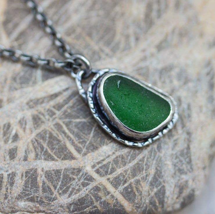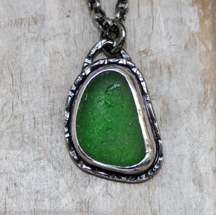 Oxidised to darken the shadows and emphasise the hammered texture of the silver this is a necklace for sea glass loving fans of weathered textures.