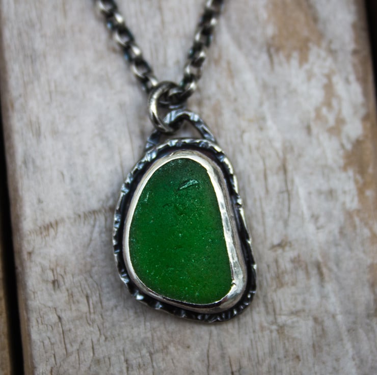 A bright green piece of sea glass fitted into a bespoke setting handcrafted from recycled fine and sterling silver.