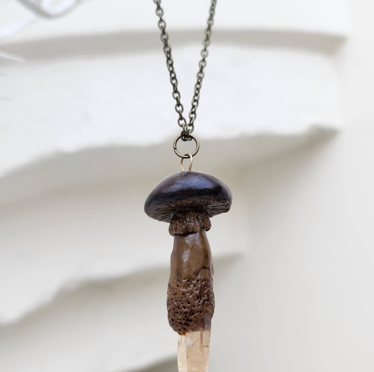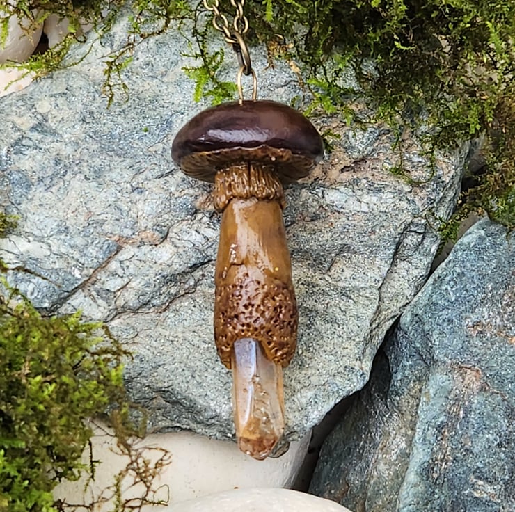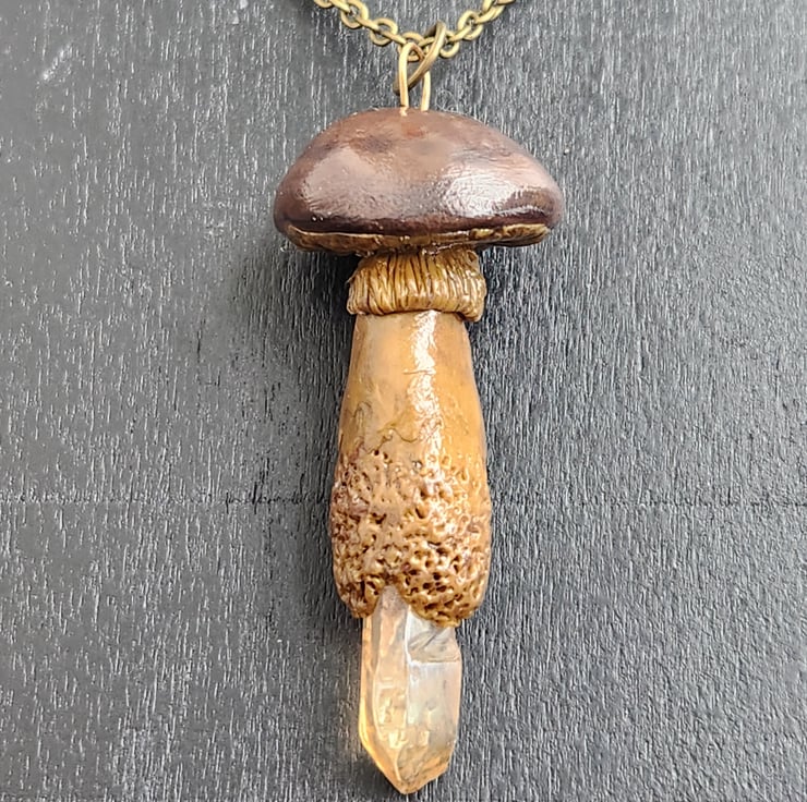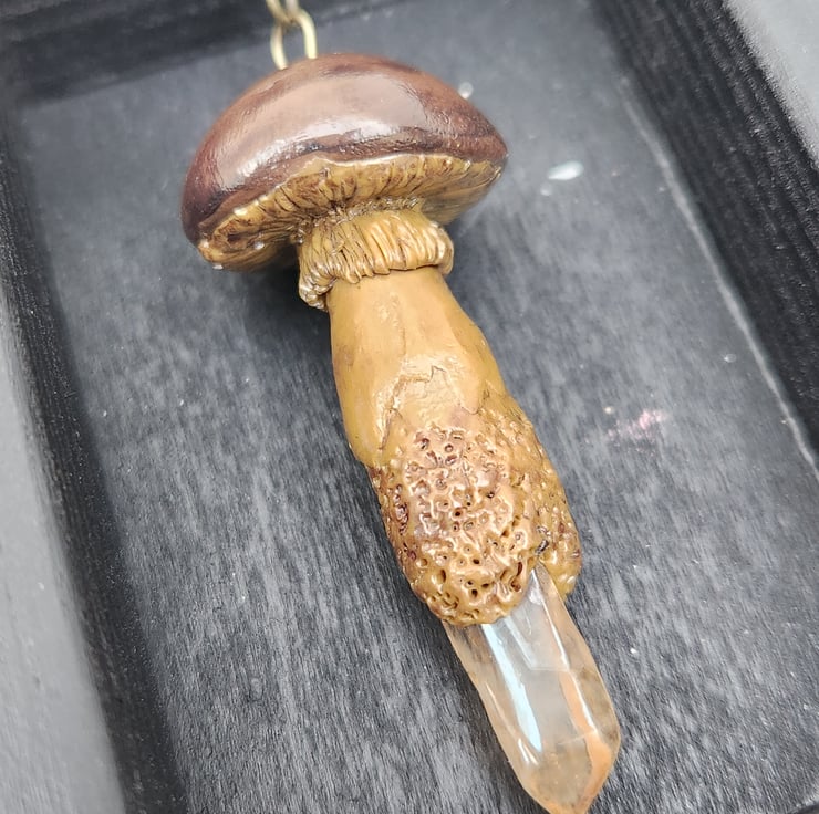 Inspired by the elegant simplicity of the woodlands, this mushroom has been sculpted into a quartz crystal pointer then painted and sealed with acrylics.