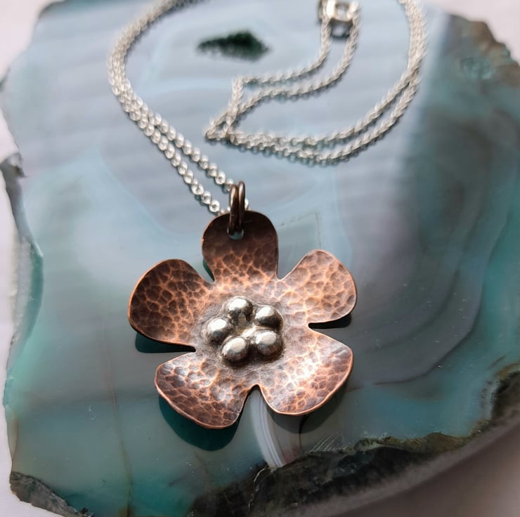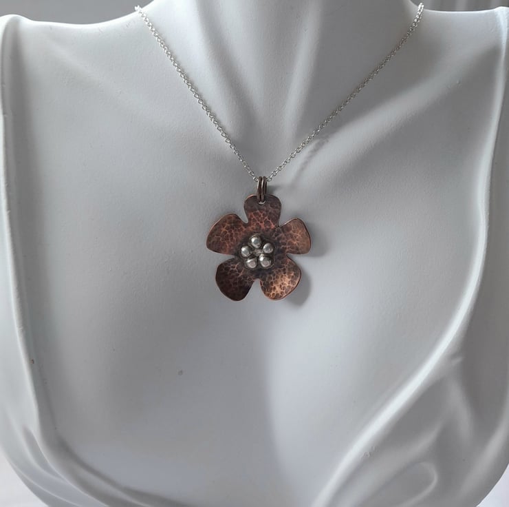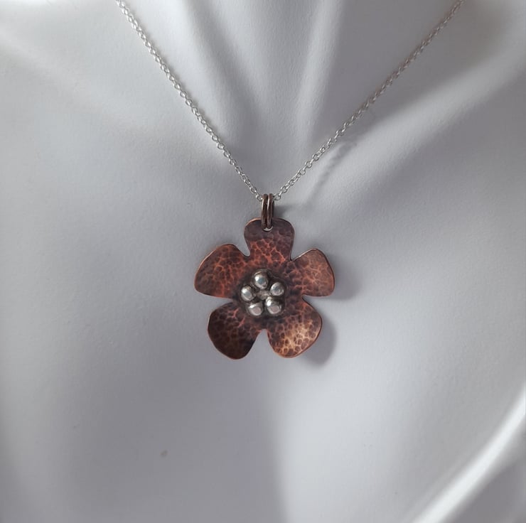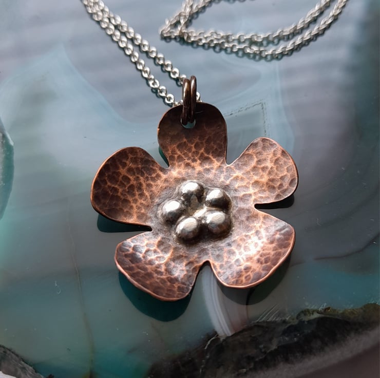 This copper and silver pendant has been cut from a sheet of copper then hammered to give texture and oxidised to give an aged look. The flower has 5 small pieces of sterling silver which have been soldered onto the copper