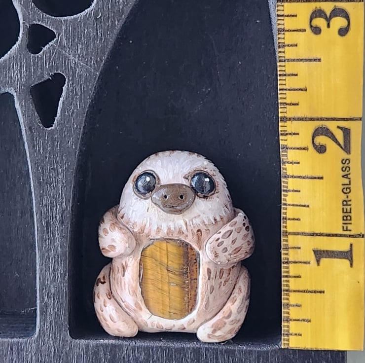 This hand painted sloth sculpture has been created without the use of moulds, and features a genuine tiger eye embedded into the piece.