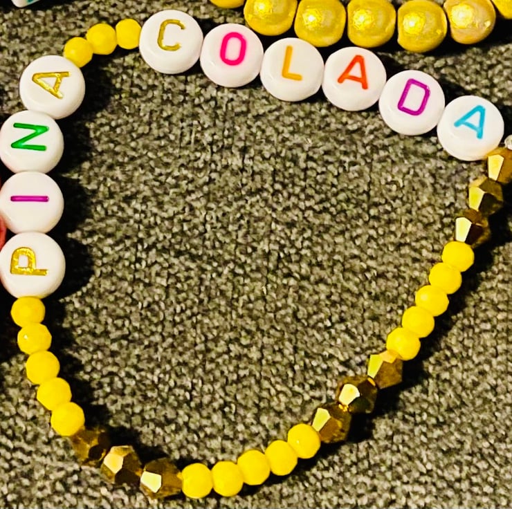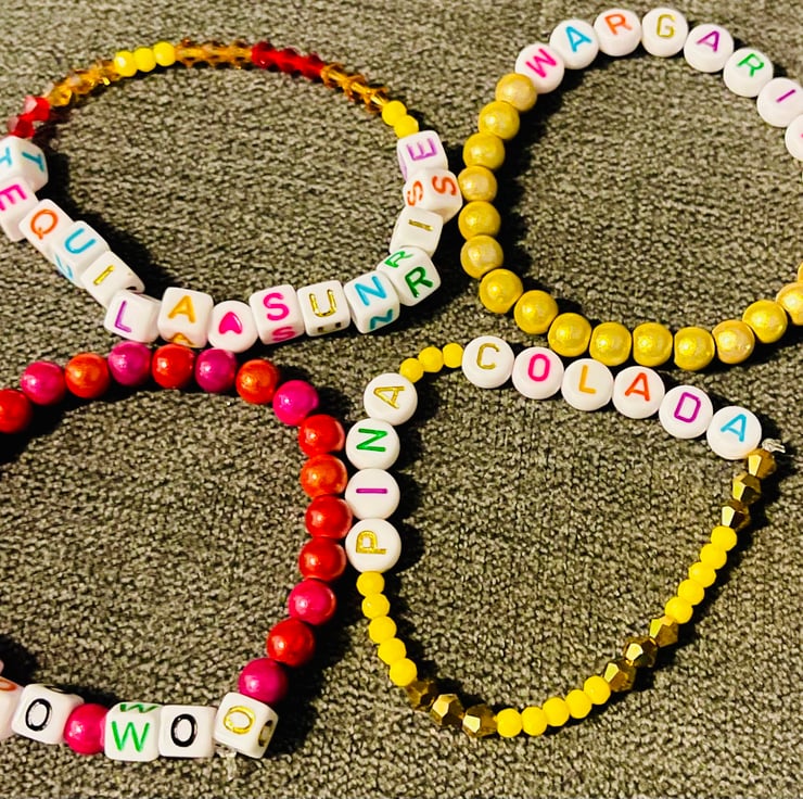 Beaded bracelets on elastic,glass beads reflect the colour of the cocktail. Fun and stylish, beach wear and by the pool