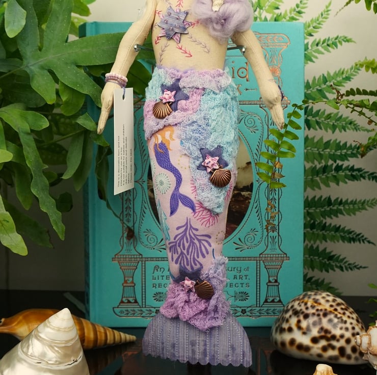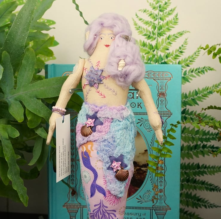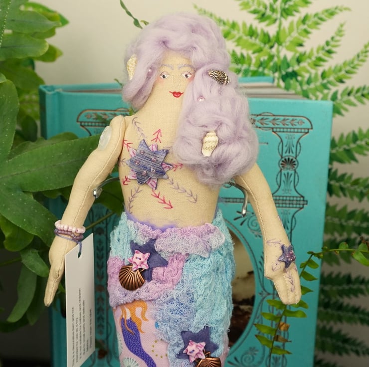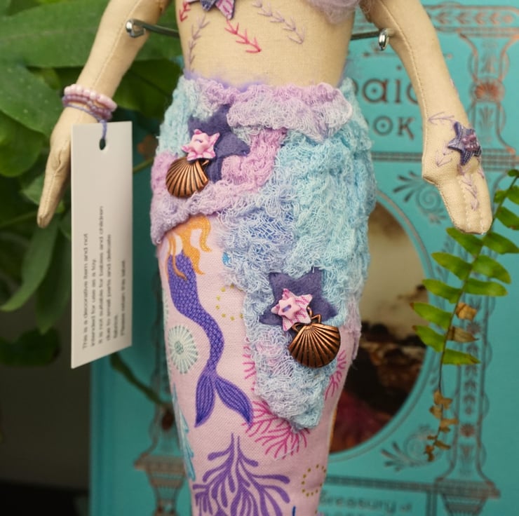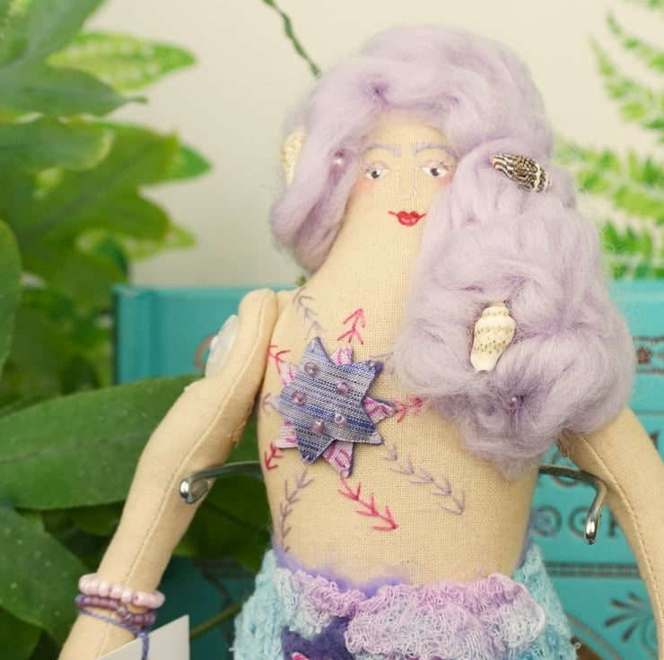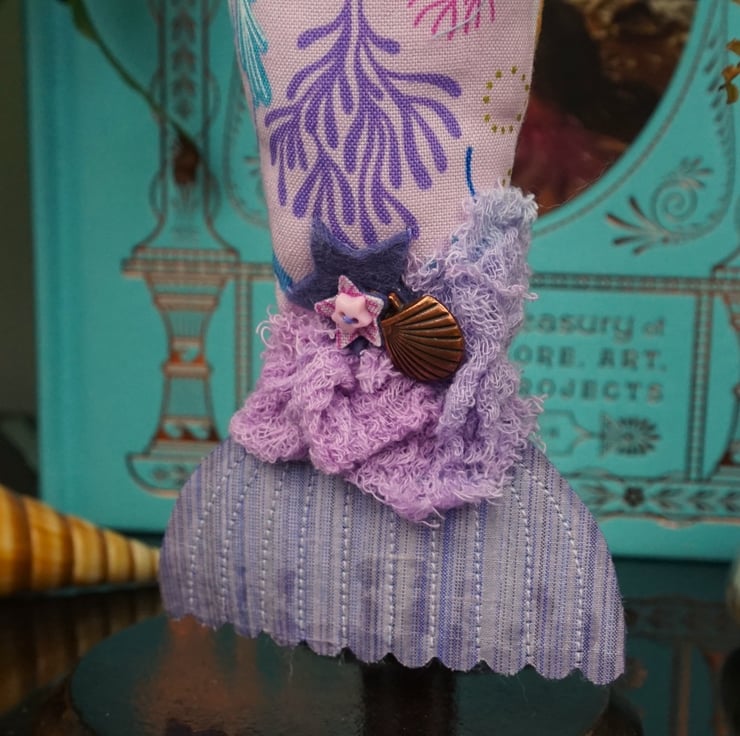 Admete is a tiny mermaid, a new pattern and a smaller size. With silk and felt detailing accentuated with sea shell themed charms and hand dyed scrim, each mermaid has a nautical fabric tail with a silk fin. I have scoured the internet looking for sea themed fabrics that appeal to me and they make the basis of each mermaid's colouring. Each tiny mermaid has her modesty preserved with a well placed starfish, which is embroidered and the design repeats on her hand.