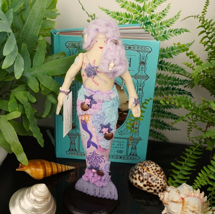 Admete has a lilac theme with a tiny piece of amethyst to her heart and soft lilac hair within in which are pearl beads and tiny sea shells. The scrim gives a nicely nautical twist and makes for a great additional texture. Each mermaid is named for a sea nymph from Greek mythology.