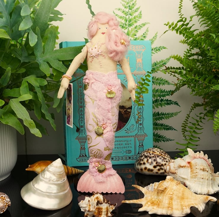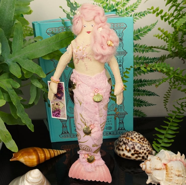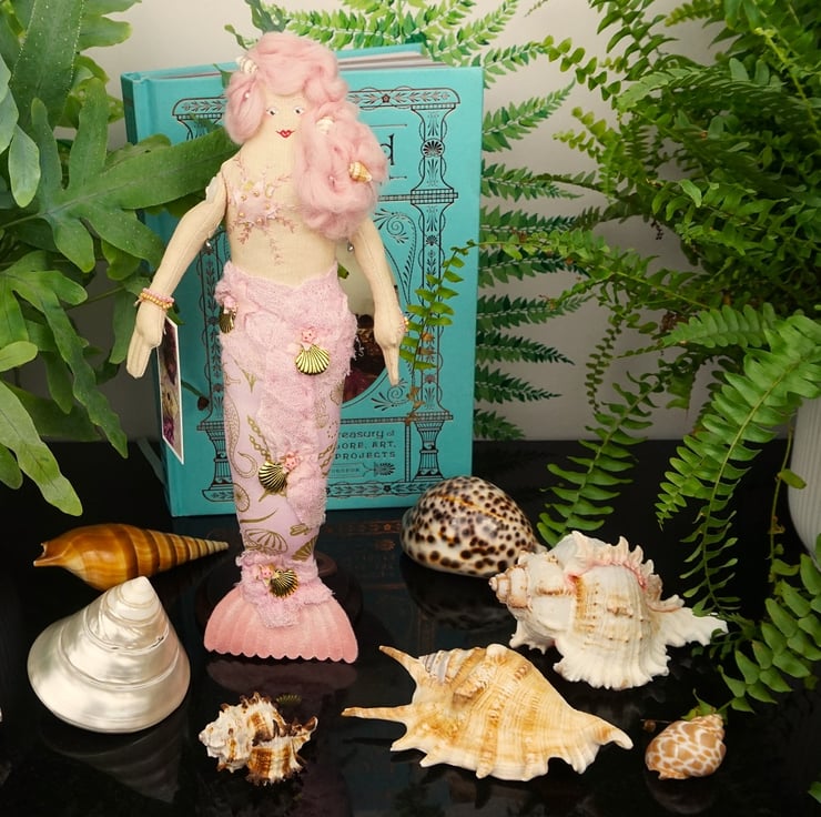 I first made a mermaid doll five years ago and was never happy with them. They were too big and too bulky. This new pattern is much smaller and more feminine with a dainty tail and lots of embroidery details. They really are a joy to make and I love hunting down 'mermaid' fabric.