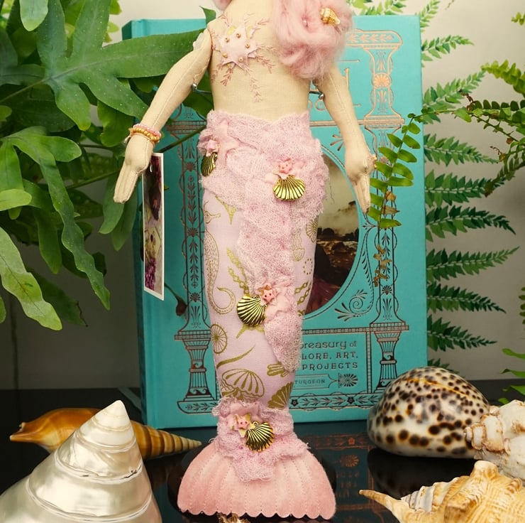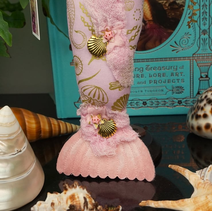 Argia is a tiny mermaid, a new pattern and a smaller size. With silk and felt detailing accentuated with sea shell themed charms and hand dyed scrim, each mermaid has a nautical fabric tail with a silk fin. I have scoured the internet looking for sea themed fabrics that appeal to me and they make the basis of each mermaid's colouring. Each tiny mermaid has her modesty preserved with a well placed starfish, which is embroidered and the design repeats on her hand.