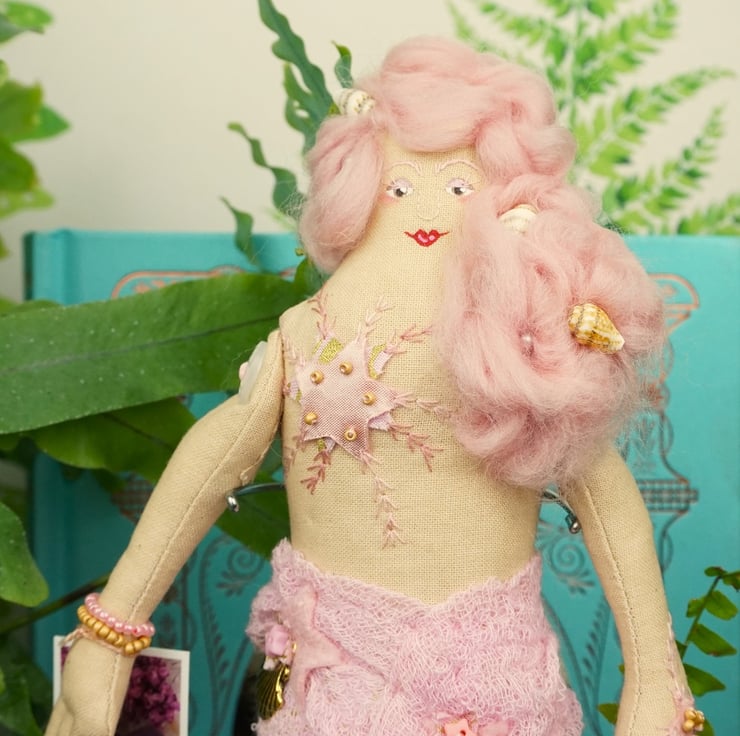 Argia has a powder pink theme with a tiny piece of rose quartz to her heart and soft pink hair within in which are pearl beads and tiny sea shells. The scrim gives a nicely nautical twist and makes for a great additional texture. Each mermaid is named for a sea nymph from Greek mythology.
