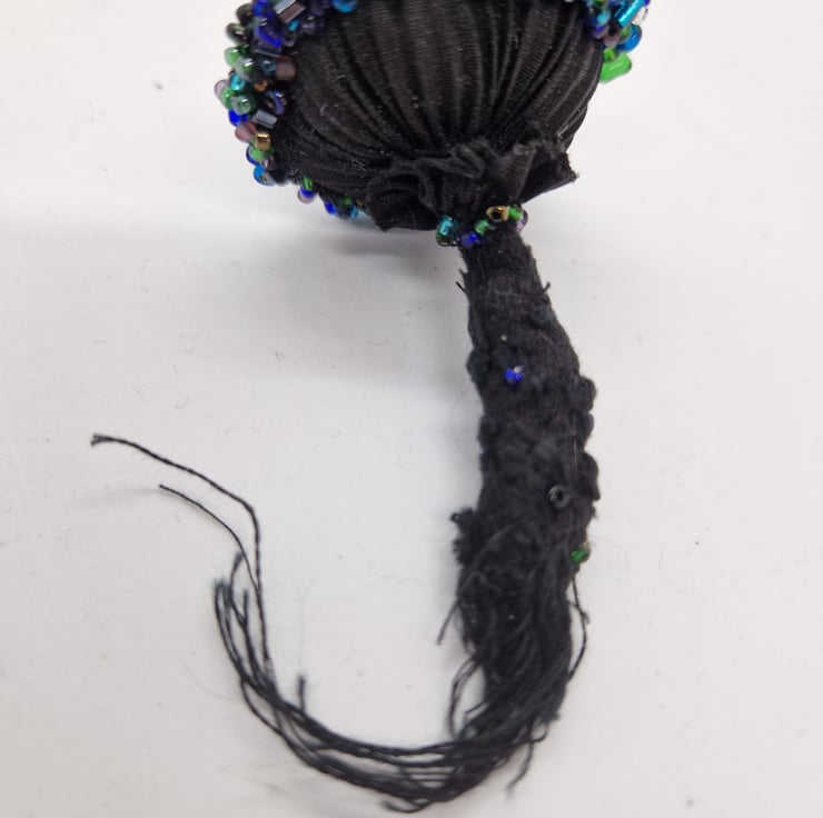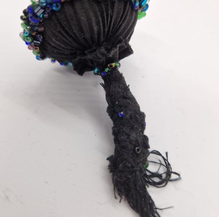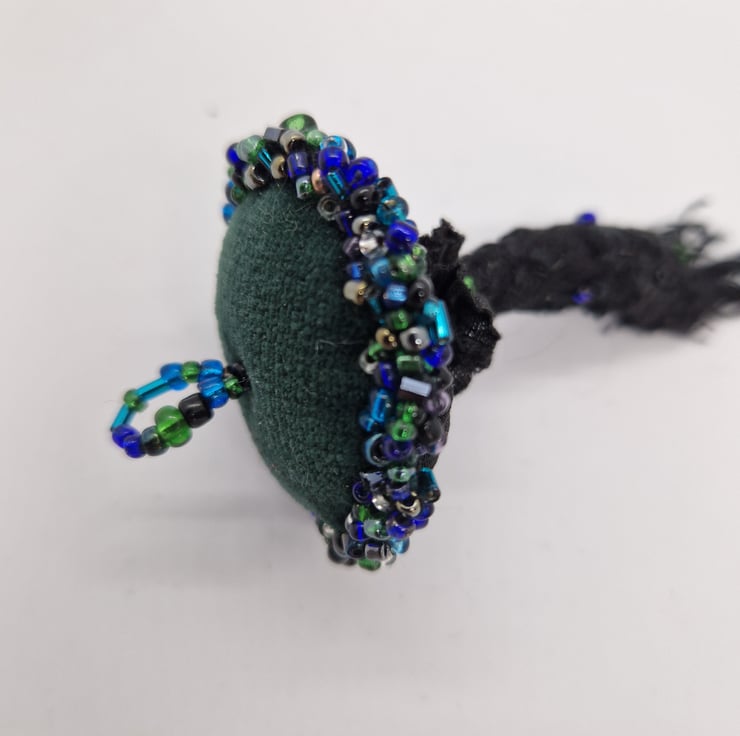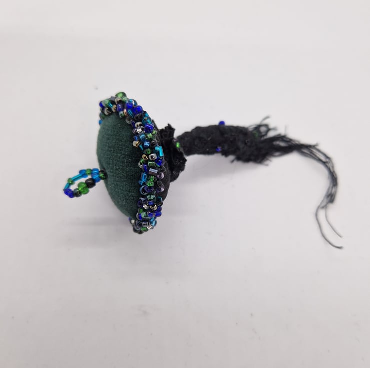 Handcrafted velvet mushroom in beautiful Forest Green with Black gills and a Black stalk made from recycled fabric. the base root has sewn cotton roots and seed beads. The plush cap is adorned with individually sewn beads and has a loop for hanging or attaching a key ring (included).Each mushroom is unique and is made from my own patterns and designs.