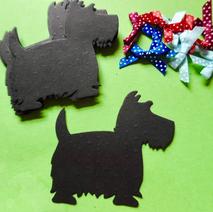 The black scotties are cut from card which has a subtle embossed pattern pattern of spots and the bows are satin with polka dots.
