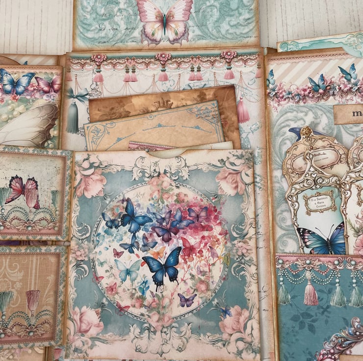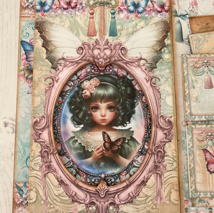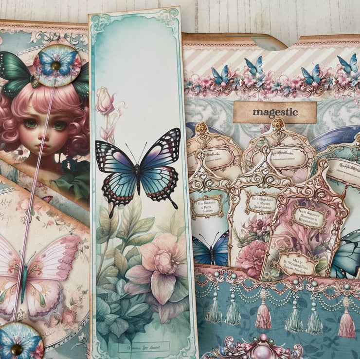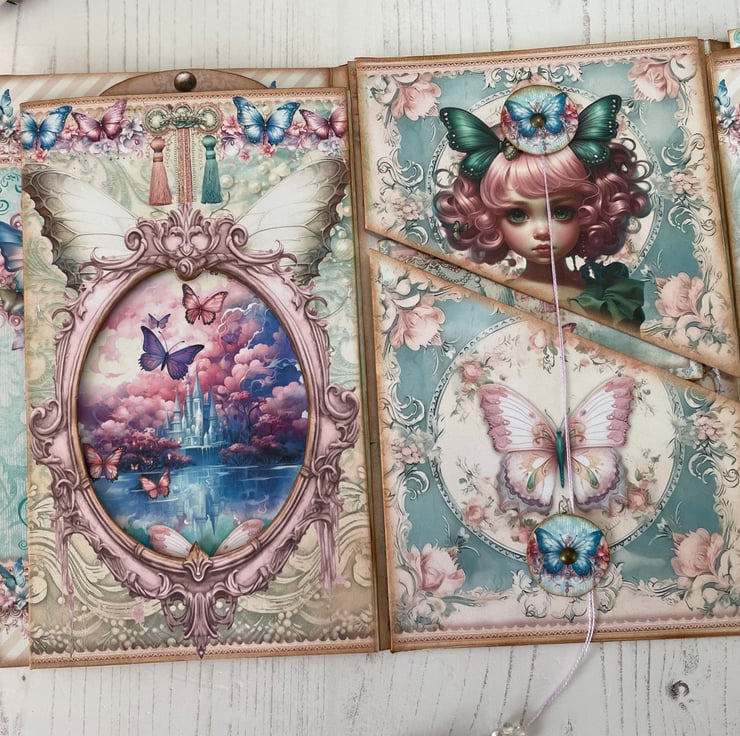 A tribute to majestic butterflies. This folder has pockets, tuck spots, flip covers revealing more pockets. Includes at least 20 tags and Journalling cards. Waterfall images just pull the butterfly and watch the images appear. Centre flaps secured with thread and pretty beads on the tie ends. Outer flap secured with a hook and loop circle. Decorated with hints of glitter and diamantés. Measures 7” x 4.5” x0.25”.