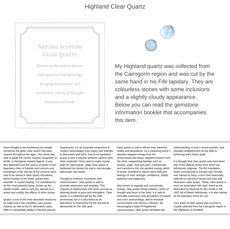 You can read the booklet that comes with my Cairngorm clear quartz designs in the images, or you can find this design with other Scottish stones in the Caledonian Keepsakes shop.