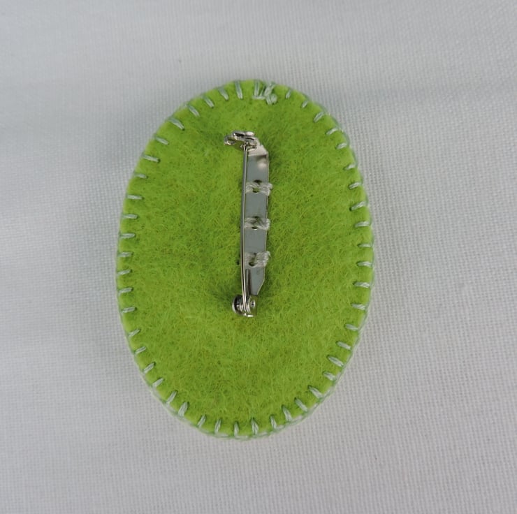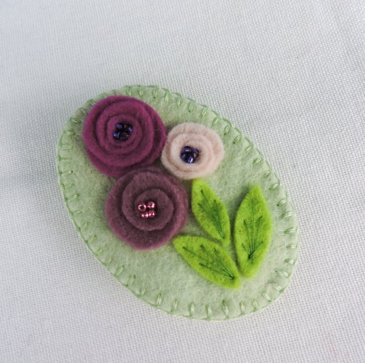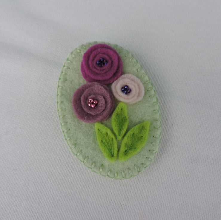 Felt brooch. Oval pale green background with three felt flowers in assorted pinks with beaded centres and a cluster of 3 felt leaves. Finished with a brooch back pin on a mid green felt backing. . All hand cut and sewn to my own design.