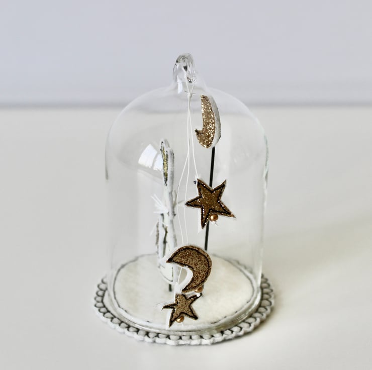 This scene is encapsulated within a glass dome, with two stars and a moon a loft; two sewn circular bases complete this delightful decoration.