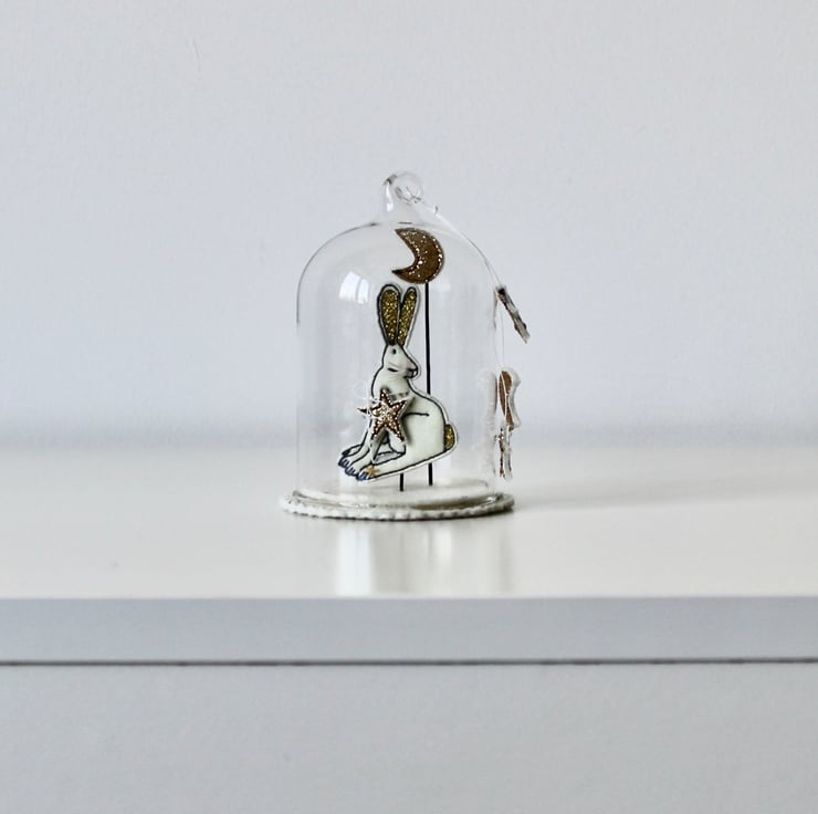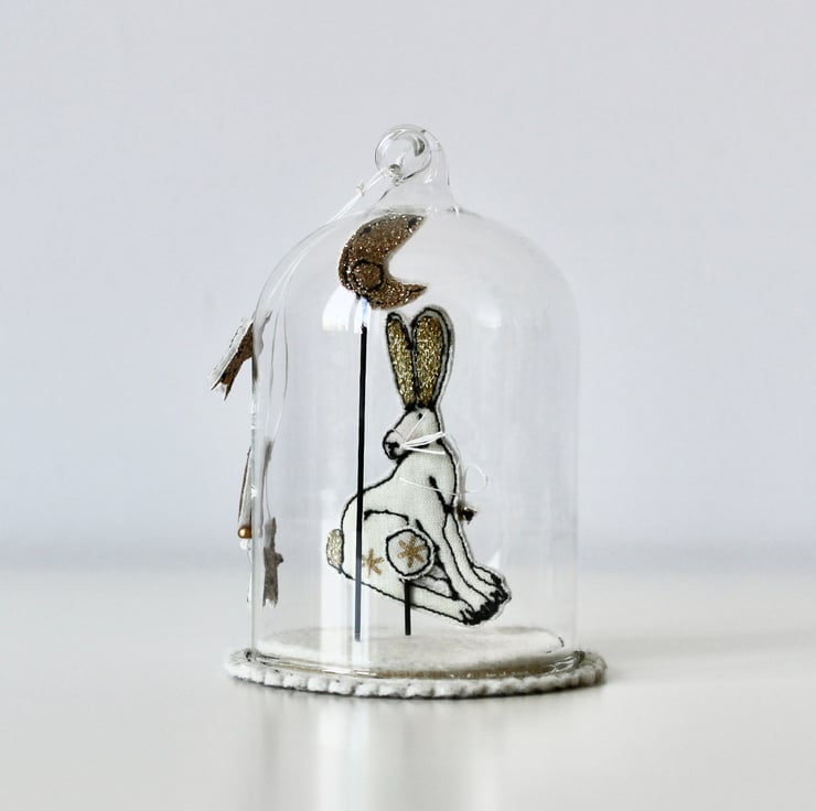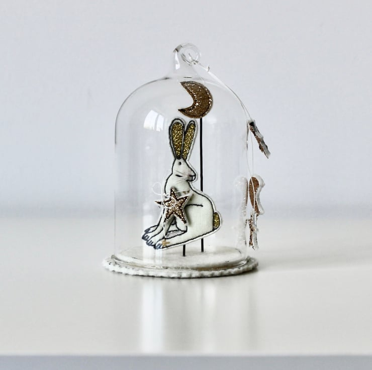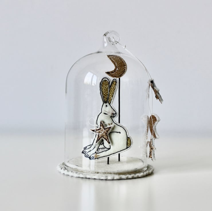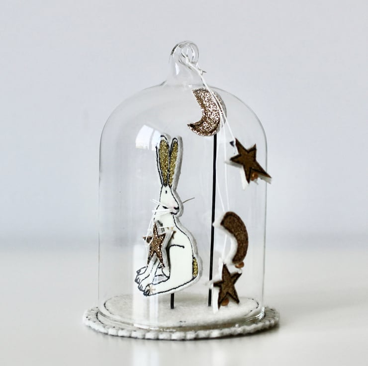 This hare glass dome is created using free hand machine embroidery, cotton cloth, glitter cloth, 100% wool felt and wire. The ears and tail of the hare are sewn using metallic gold coloured thread.
