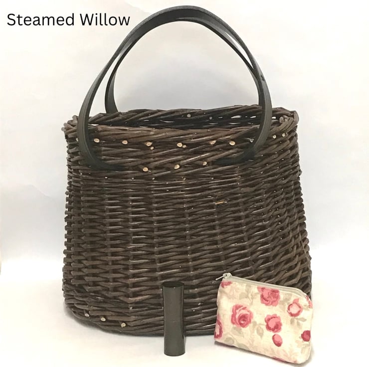 A classy oval willow basket/handbag handwoven from Steamed Black Maul willow and finished with English leather handles handmade by my friend Becs Ball from Bosorne Leatherwork. All handmade in our small workshops in Cornwall.