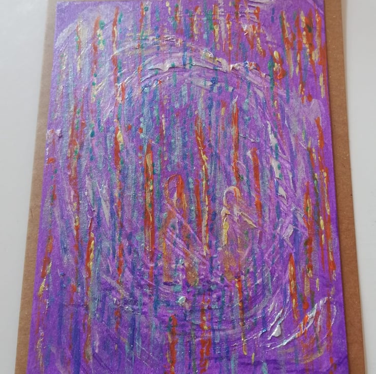 I hand paint all my paintings and card pieces in my room in Chester. I often go within and allow myself to paint and explore what comes through. This piece I felt a bold desire to paint a very vivid colour purple and later came the orange and yellow lines. I left it for a day or so not sure what to expect but trusting the flow. Then when I was more centred came the impulse to be sure and paint the silver circle and if you look carefully there are two figures in the cave almost like they are searching for lost treasure. At least that's what I felt.