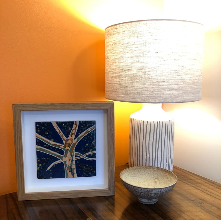 After rolling a slab of stoneware clay I have carved into the tile to define the plane trees trunk and branches-isn't the bark amazing!. After biscuit firing I have used a range of coloured underglazes to recreate the magic of the plane tree which I spotted on a trip to New York! The tile is finished with a clear glaze and baked to 1220 degrees!