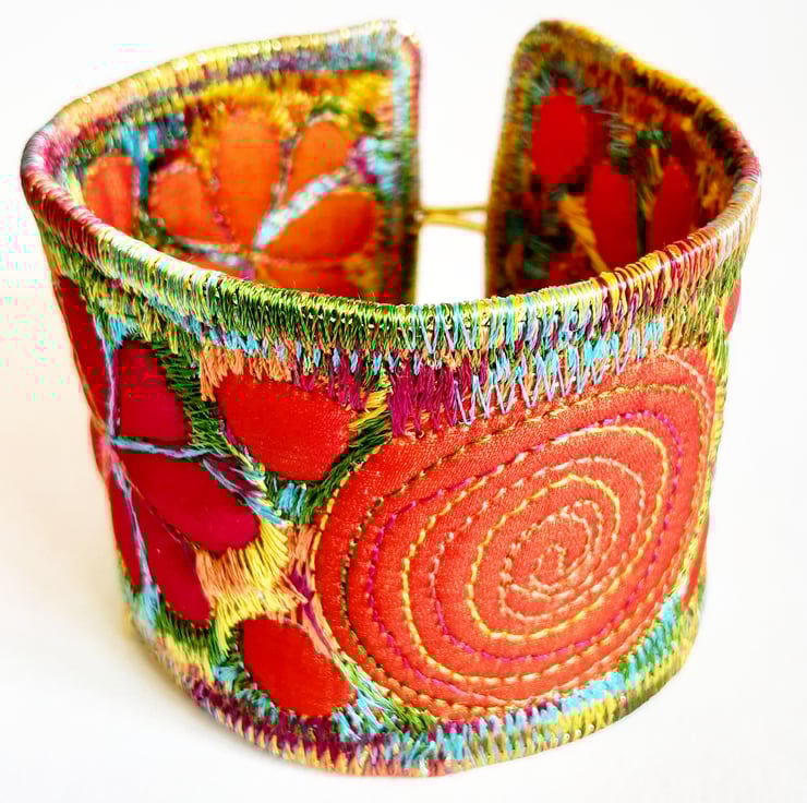 This is a handmade machine stitched fabric Stiched Silk Cuff or bracelet.which changes color as itmoves round.
