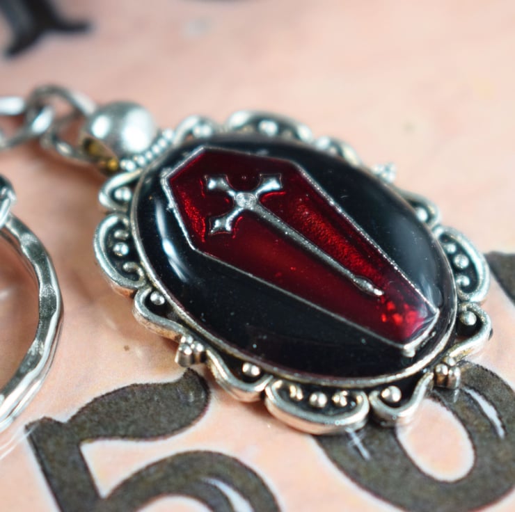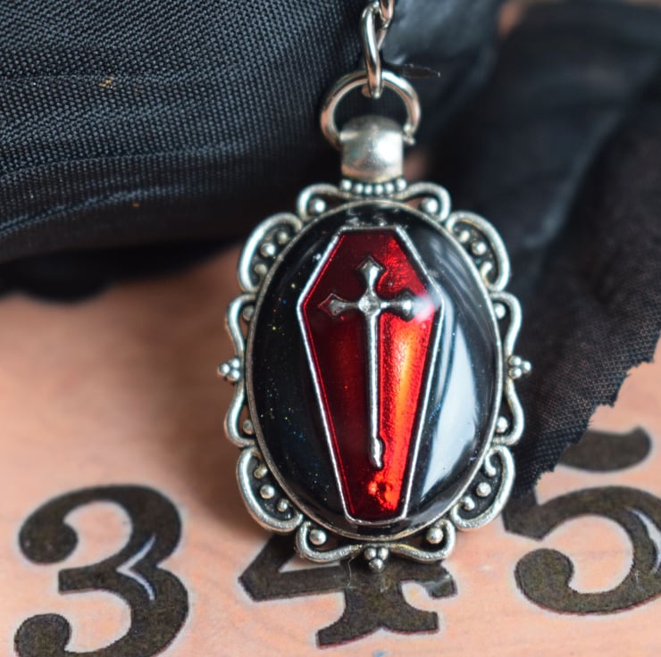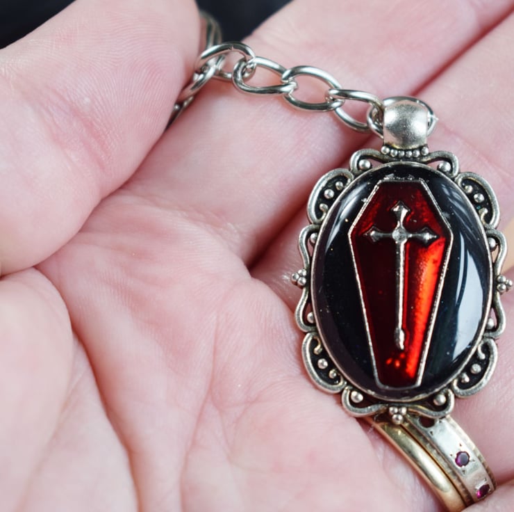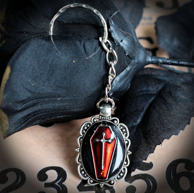 The red coffin lies on a black background and then the whole of the pendant is given a glossy coat of clear resin to keep it protected. They keyring itself is silverplated and is nice and sturdy to keep your keys safe.