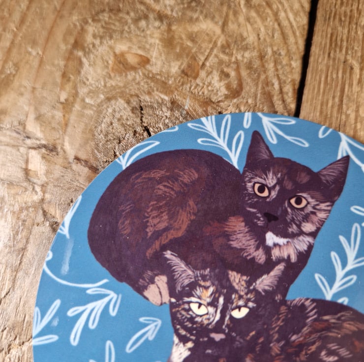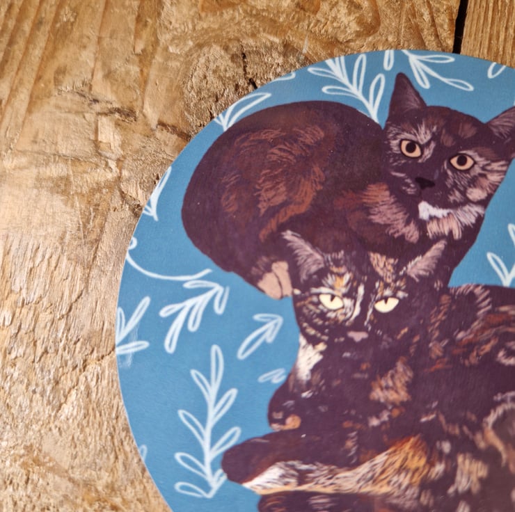 Cat coaster illustrated by me and based on my parents cats - Kumiko at the back and Shelby at the front.