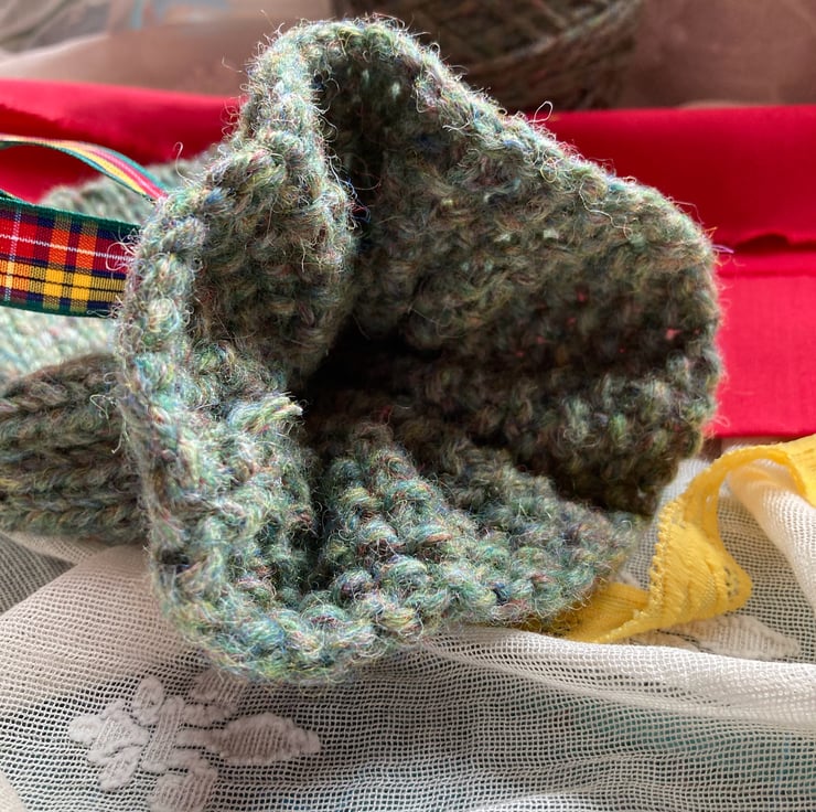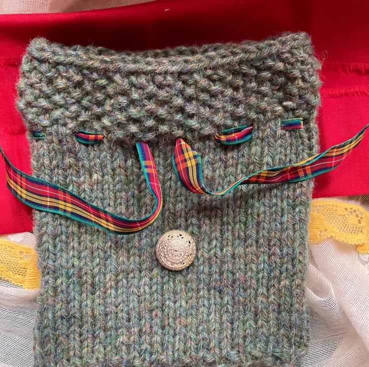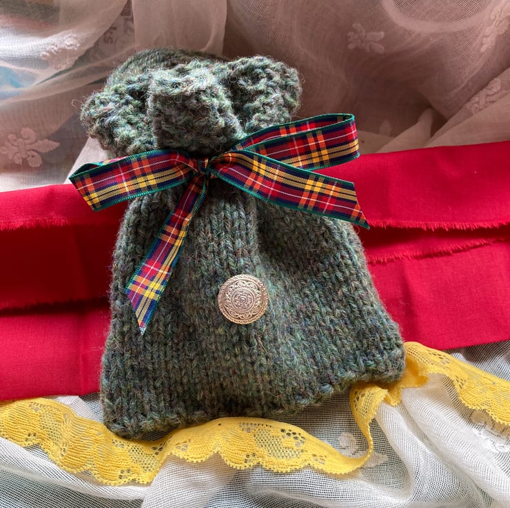 This gift bag is hand knitted in chunky 100% pure new wool(see label). Can be used for birthdays, treats and thank you gifts.