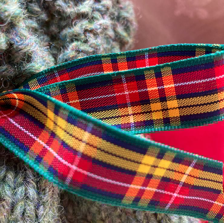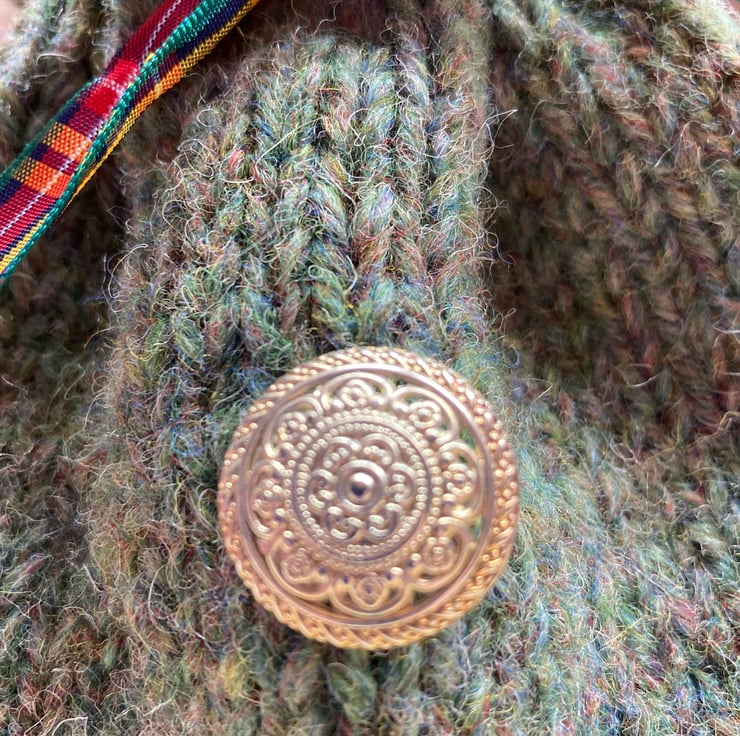 It has a gold coloured metal button at the front. Finishing it off is a tartan Buchanan ribbon.