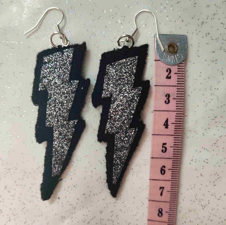 The earrings measure nearly 7cm from top to bottom and each bolt of lightening is cut out by hand and stitched together by hand before being attached to a silver coloured ear wire