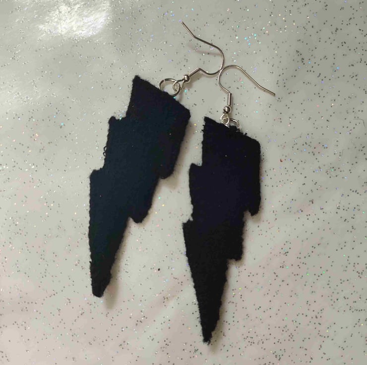The earrings measure nearly 7cm from top to bottom and each bolt of lightening is cut out by hand and stitched together by hand before being attached to a silver coloured ear wire