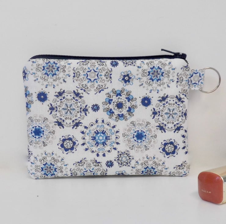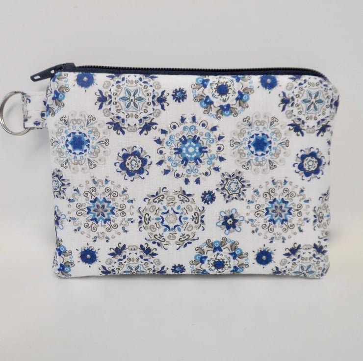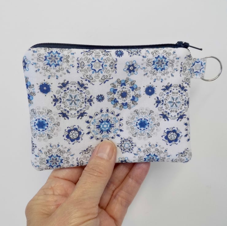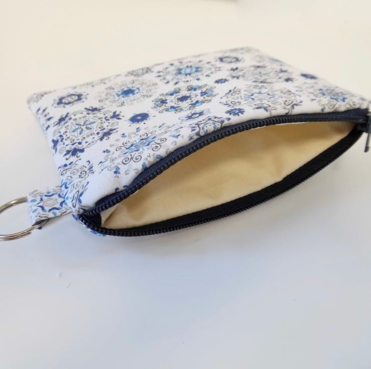 This coin purse is made using a quality quilting cotton which has a white background printed in blues and beige, the print is like little mandalas. I backed the fabric with fusible fleece for softness and body and have inserted a jump ring into one of the side seams so that it is easy to attach to your keyring or inside a bag. Lined with plain cream poly/cotton fabric.