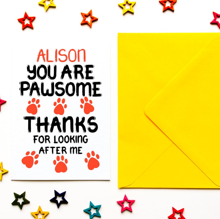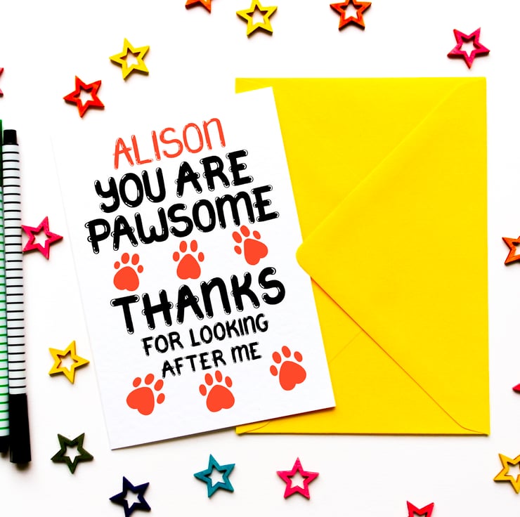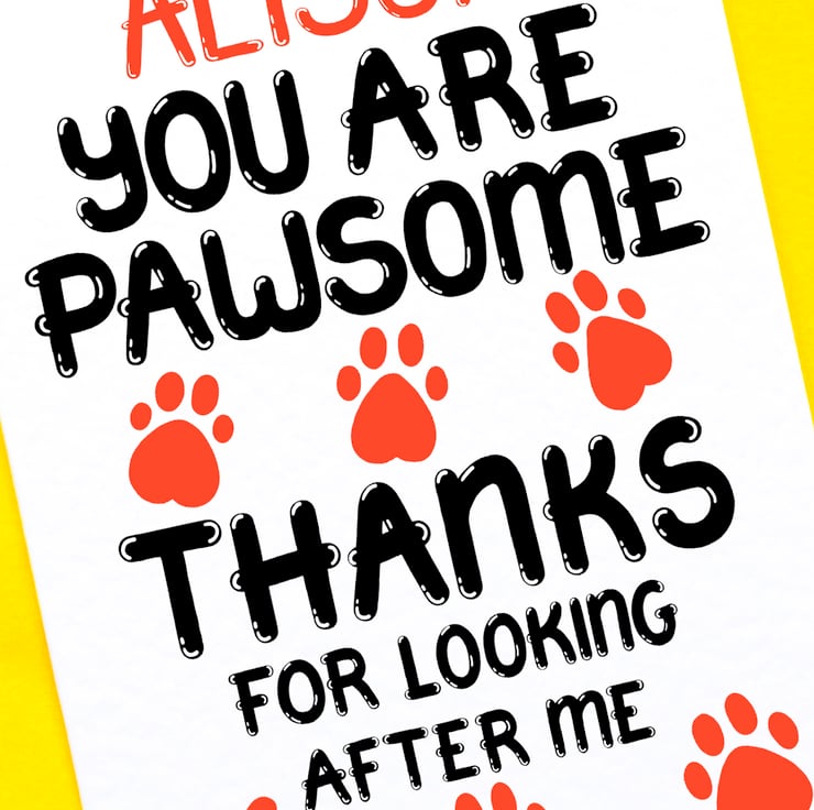 Greeting on front: (NAME) YOU ARE PAWSOME THANKS FOR LOOKING AFTER ME