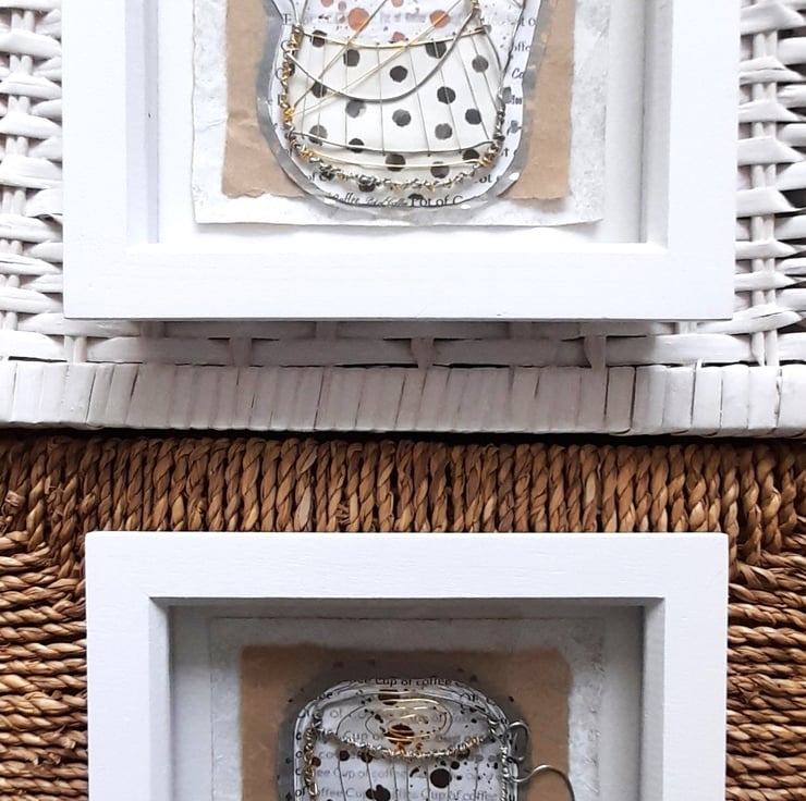 My wire Pot of Coffee is an original handmade mixed media artwork. The coffeepot is sculptured from silver coloured wire, with gold coloured wire wrapped around for extra decoration & shine. I’ve handstitched onto the coffeepot using silver thread. For the wording, I’ve typed 'pot of coffee', repeating it by using all the different computer fonts beginning with P, just to add a different visual dimension. Over this is a layer of white tissue paper with bronze splashes to add a bit of shimmer & to soften the wording. I’ve used spotted paper, grey with gold speckled tissue paper, brown wrapping paper, my signature brown wrapping paper textured with white gouache & acrylic paint & white watercolour paper. Some of the paper’s edges have been torn to emphasize the paper texture. To show off the wire, I’ve kept the background to white & neutral tones. It also means my artwork will fit perfectly into any home. It can be hung on the wall or can sit on a shelf/bookcase. I’ve also made a Cup of Coffee artwork. Buy as a pair or individually. The coffeepot measures 9.5cms by 8cms at its widest part. The watercolour paper measures 15cm by 15cm. The artwork is ready to be framed to fit into a 6 inch (15cm) by 6 inch (15cm) frame without a mount.