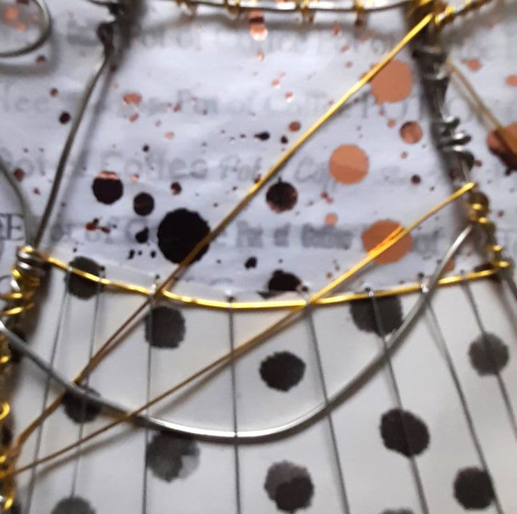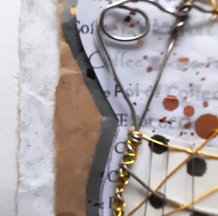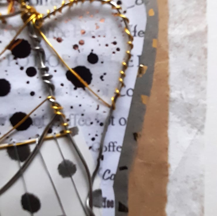 My wire Pot of Coffee is an original handmade mixed media artwork. The coffeepot is sculptured from silver coloured wire, with gold coloured wire wrapped around for extra decoration & shine. I’ve handstitched onto the coffeepot using silver thread. For the wording, I’ve typed 'pot of coffee', repeating it by using all the different computer fonts beginning with P, just to add a different visual dimension. Over this is a layer of white tissue paper with bronze splashes to add a bit of shimmer & to soften the wording. I’ve used spotted paper, grey with gold speckled tissue paper, brown wrapping paper, my signature brown wrapping paper textured with white gouache & acrylic paint & white watercolour paper. Some of the paper’s edges have been torn to emphasize the paper texture. To show off the wire, I’ve kept the background to white & neutral tones. It also means my artwork will fit perfectly into any home. It can be hung on the wall or can sit on a shelf/bookcase. I’ve also made a Cup of Coffee artwork. Buy as a pair or individually. The coffeepot measures 9.5cms by 8cms at its widest part. The watercolour paper measures 15cm by 15cm. The artwork is ready to be framed to fit into a 6 inch (15cm) by 6 inch (15cm) frame without a mount.