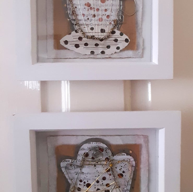 I’m based in West Yorkshire and make my artwork in my spare time. I love to create handmade mixed media art combining wire, paint, pencil, wording, interesting papers; textured, patterned or handmade. I often hand stitch onto the pieces as well. Wire is so versatile and has such malleability. It adds dimension and structure. Cups of tea & coffee, cats, flowers, nature, geometric shapes and architecture are my favourite inspirations. Oh and love of course! The pieces are all my own designs and are created by me. From traditional cottage to modern contemporary in style and so will suit any style of home.