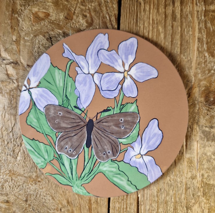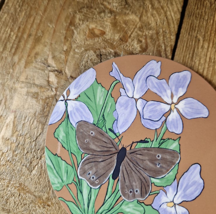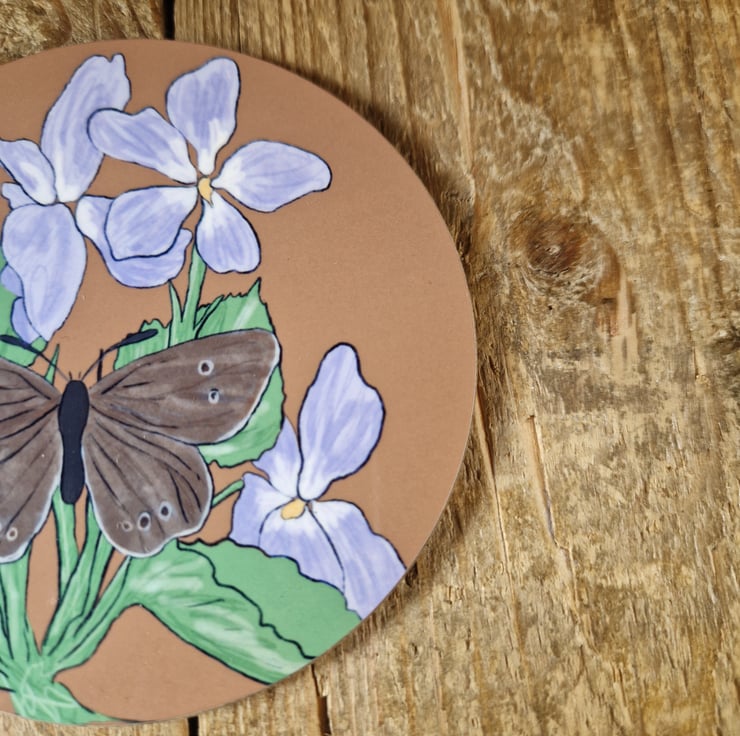 Ringlet butterfly and hairy violet coaster designed by me and made in the UK.