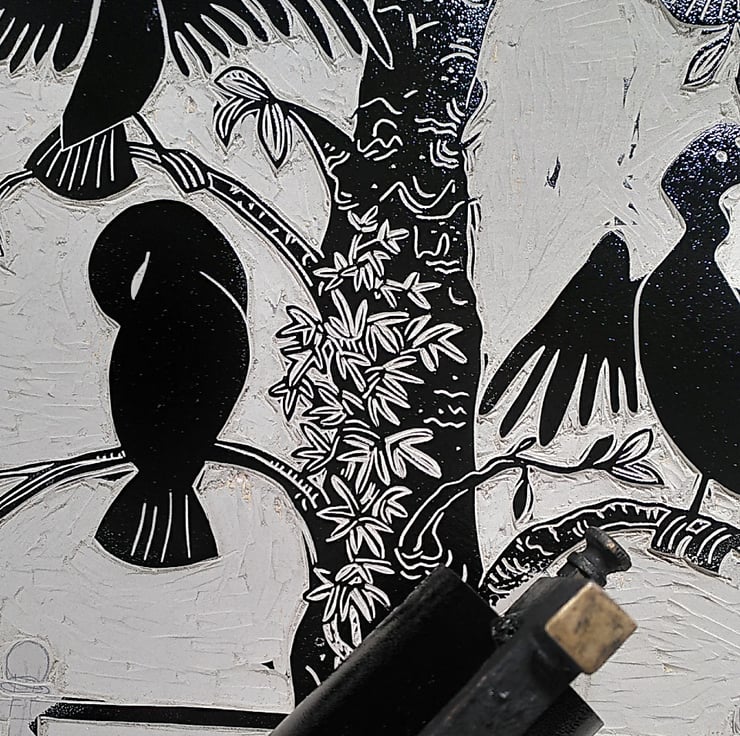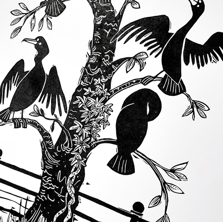 A black and white lino printed image of our local Cormorant Roost in the middle of the city of Bristol. Such beautiful birds and great to have them living so nearby.