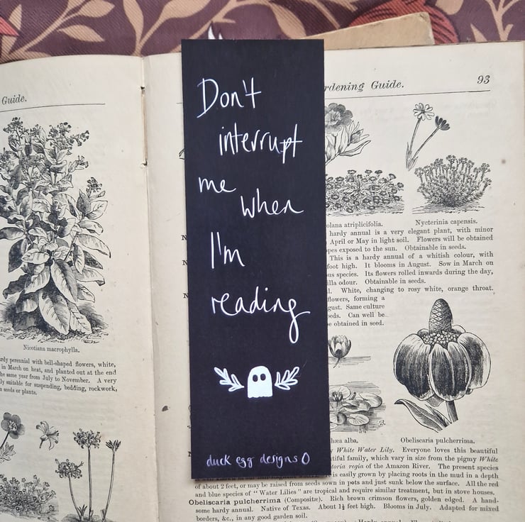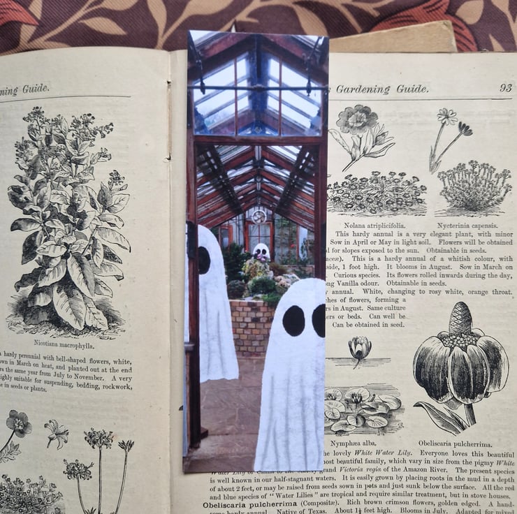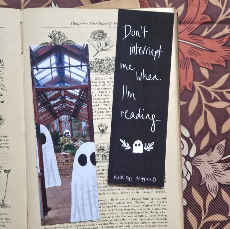 Pack of two double sided ghost bookmarks featuring the Cambridge Botanics greenhouse, with a black back featuring the words ‘Don’t interrupt me when I’m reading’ in white above and illustration of a ghost.