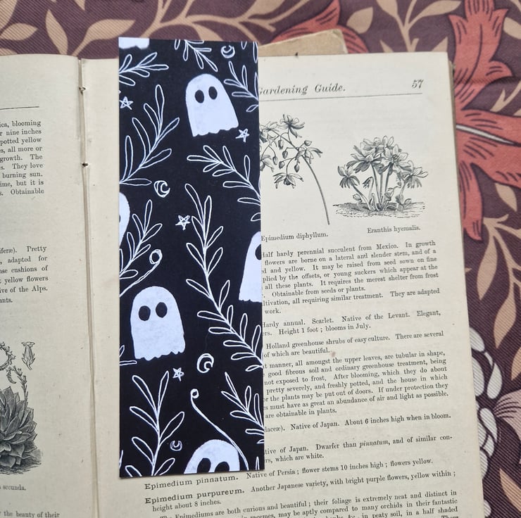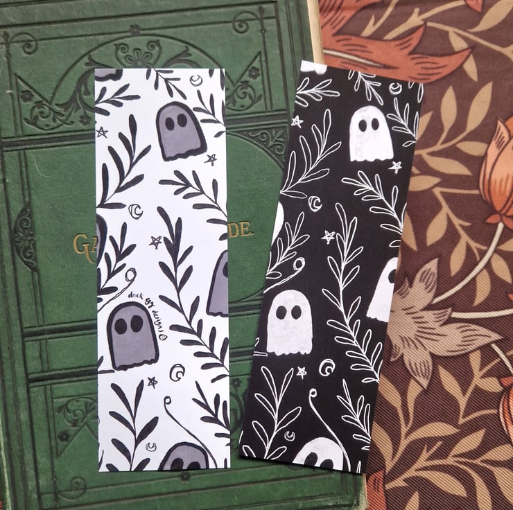 Set of two patterned double sided ghost bookmarks - one side with the white pattern and one with the black. Illustrated by me and made in the UK.