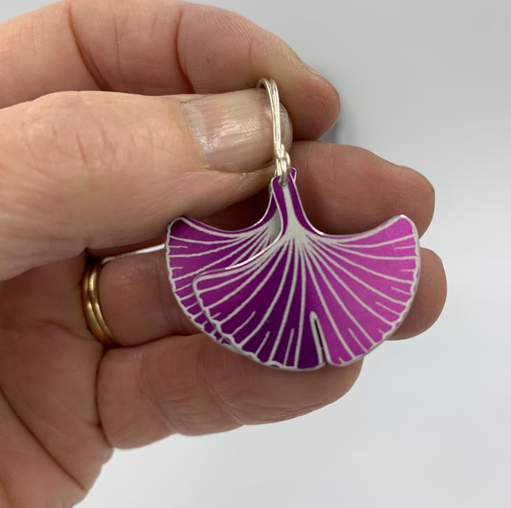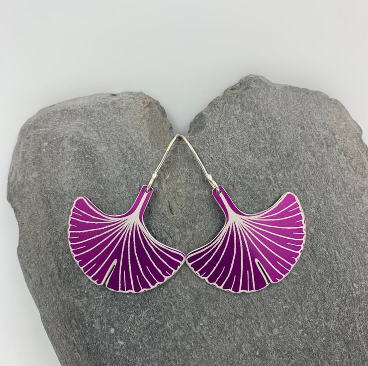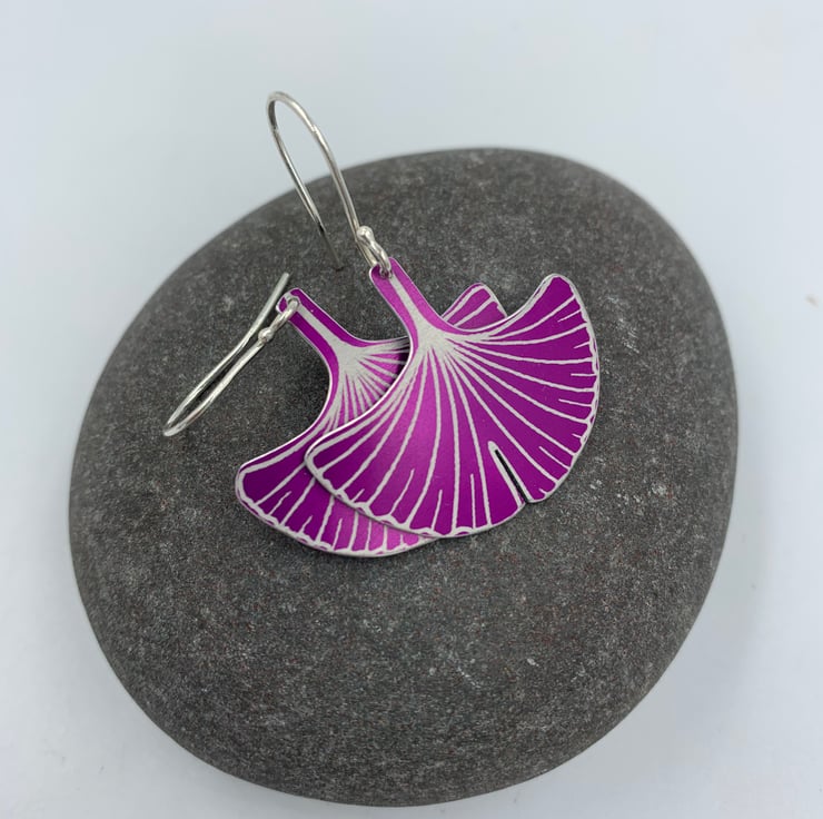 Who doesn’t love a ginkgo leaf? These lightweight anodised aluminium earrings have been etched with my hand drawn ginkgo leaf design. They have been dyed a stunning dark pinky purple and hang from handmade sterling silver ear hooks.