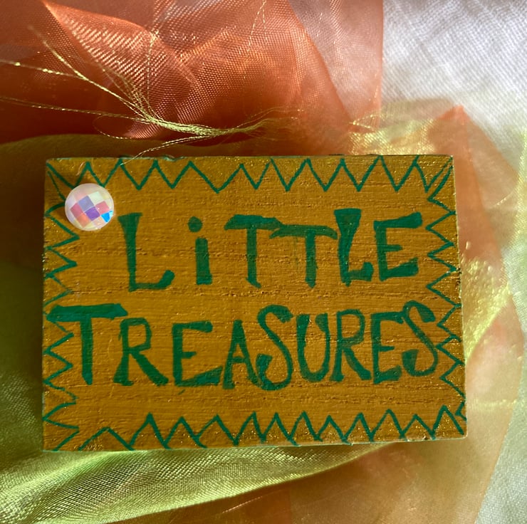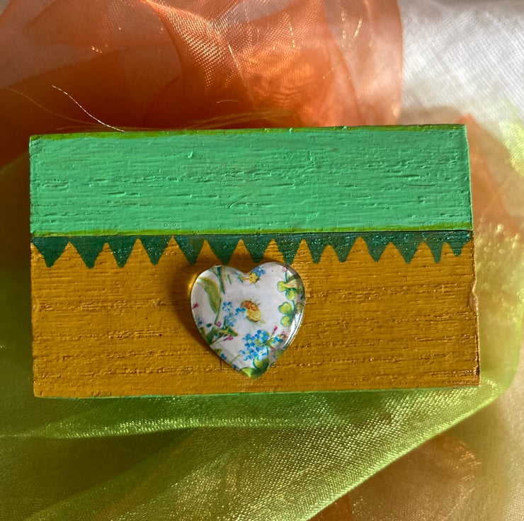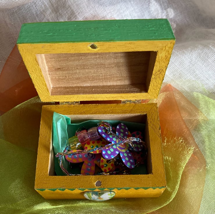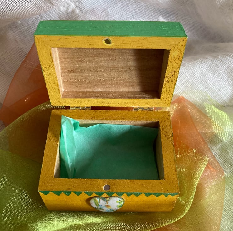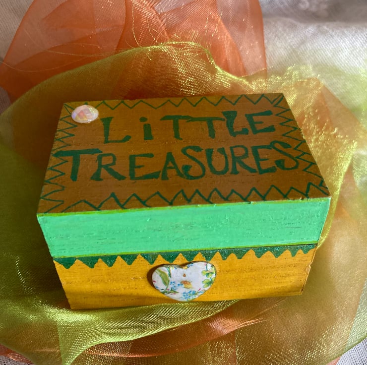 This wooden box has been hand painted in yellow and green with the words LITTLE TREASURES written in green paint. There is a zig zag design on the lid and top of base.