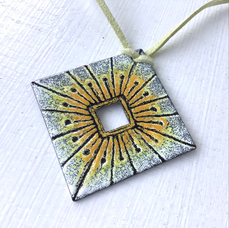 My Square Enamelled Pendant - Square View has a stainless steel base which is enamelled with specialist glass powders to create this powerful design. Layers of enamel are built up with firings in between, the design being hand drawn in the powder before the piece goes into the kiln for the final time. The back is not enamelled.